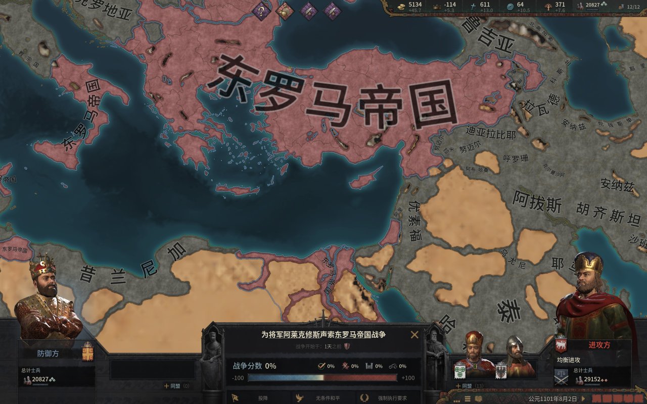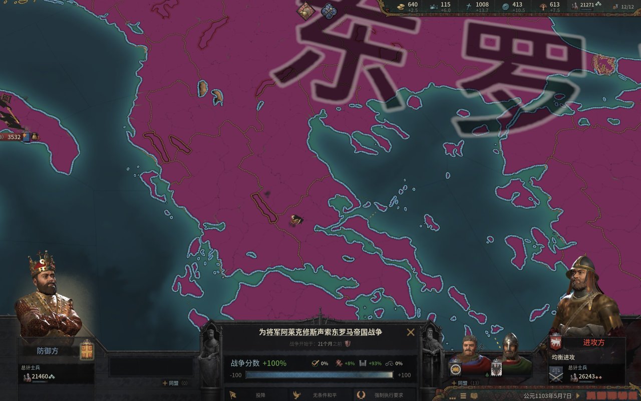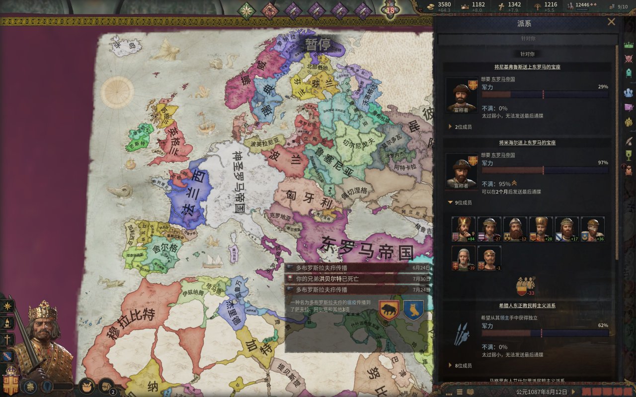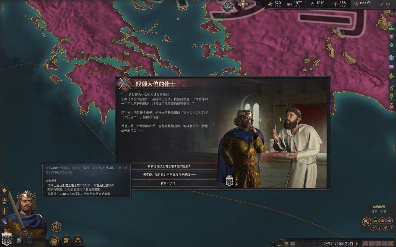 而我們的公爵也就如願的當上了西西里國王,然而,在國王朝聖的旅程中,一位修士找上門來,希望我們的國王能夠幫助他奪取大位,而報酬則是整個伊庇魯斯!(這段就是p社自己造歷史,羅伯特大舉進攻東羅馬的原因是米海爾七世以重金和聯姻爲由,與羅伯特結盟,但是米海爾被希臘三連後,這個報酬就泡湯了,而這位修士就是羅伯特所擁立的“米海爾七世)國王一聽,這可太好了,又有一大塊地可拿。