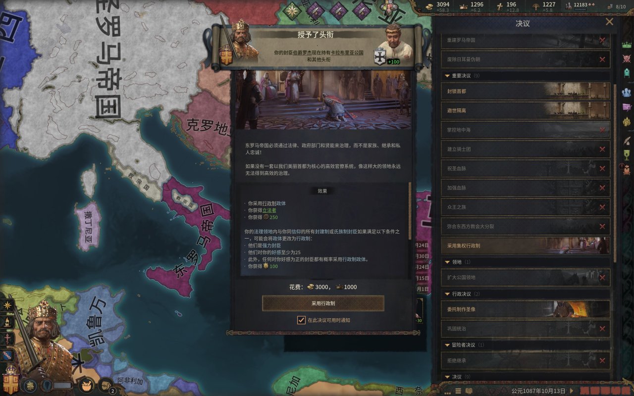 當然,還是有些野心勃勃的臣子想挑戰我們的位置,但是現在我們的皇帝的目標是其他的聖地以及其他的軍事重地。而我們也必須採用行政制,這樣纔能有效的集中我們的力量。(打下後的帝國是聯盟分割繼承,能用就怪了)