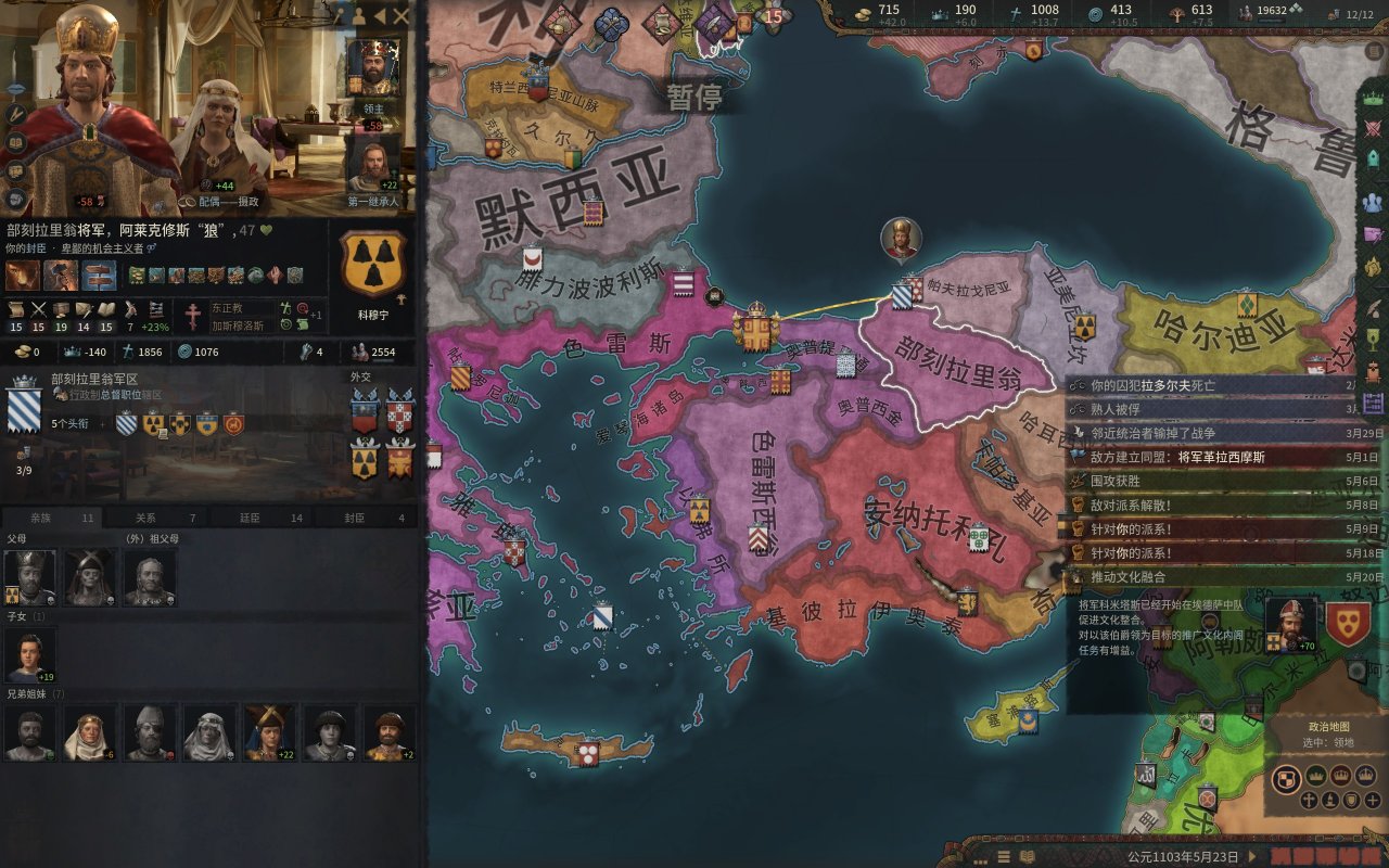 當然這位皇帝顯然當不了多久,但是國王現在正在視察新徵服的土地(拉文化認可,這個主要是爲了減少叛亂和融希臘文化),以及招納人才,沒時間理他。