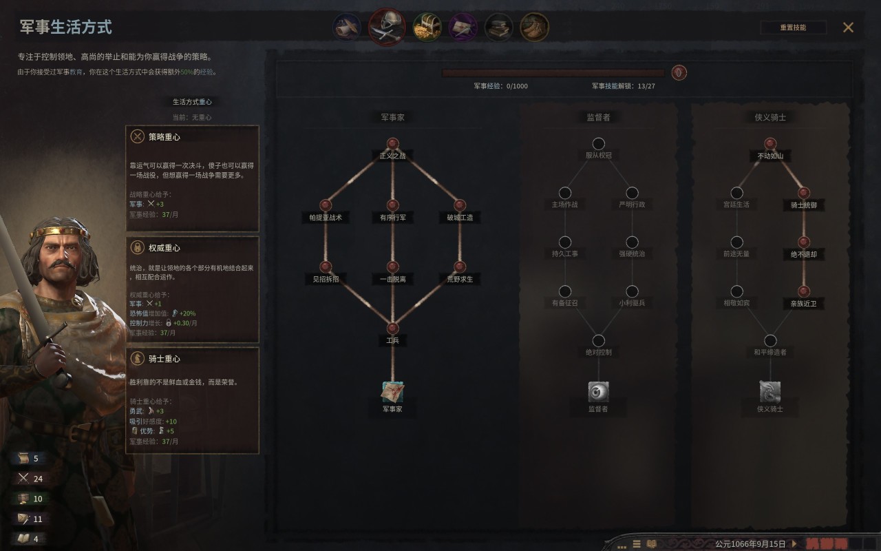 軍事線的技能點其實很好,左線可以全點,而中線把服從王冠點下,而右線則把騎士相關的那幾個技能點點完,如果你有足夠的兵力,基本上除了神之鞭,基本上沒有你打不過的對手。