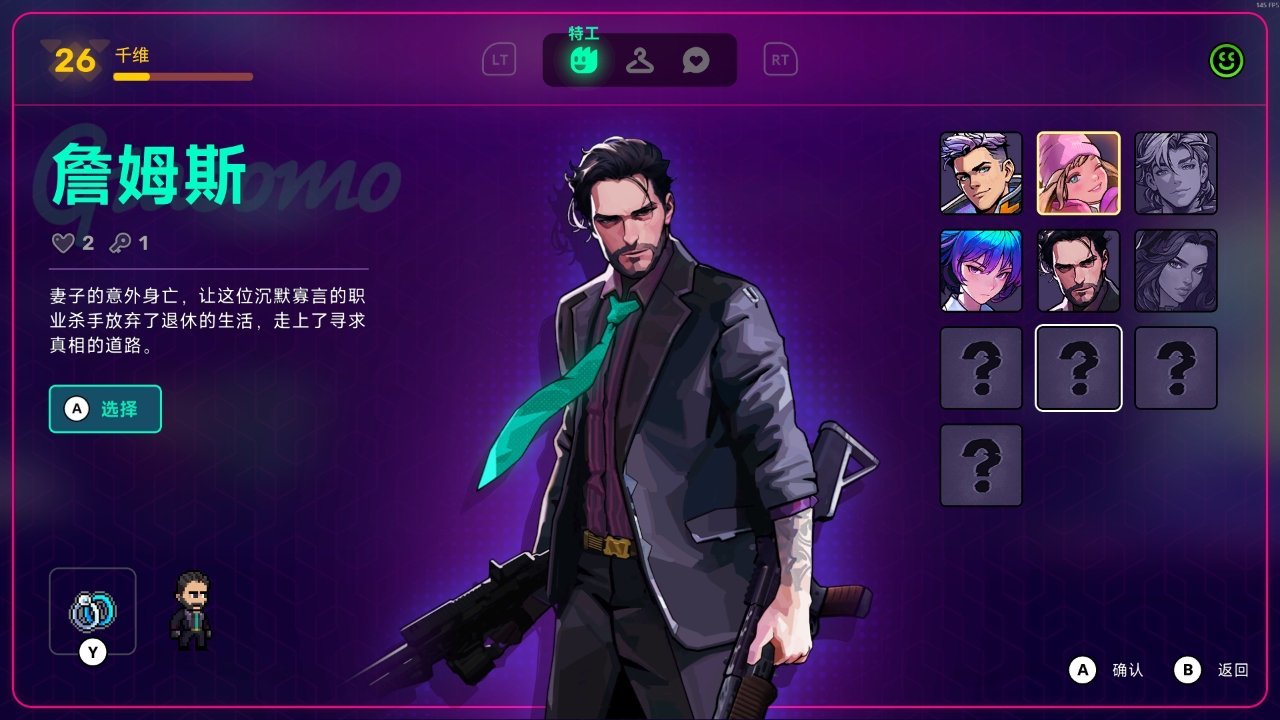 目前一共有六个角色可供选择,初始只有“尼可”,随着游戏流程进行,可以解锁后续角色,游戏的立绘很不错,尤其是作为一个像素风的游戏,立绘较比一代,更为精细化可。但是!这个角色强度方面,嗯……还是有调整空间的,比如第二个角色艾丽莎,强度就比较高了,初始四点血,武器还很强势,只是少了个初始手雷而已,而后续其他角色,初始血量有点低了,两滴血,触之即死,倒是适合“糕手”玩家玩玩速通。