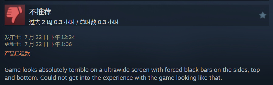 而国外网友的差评点普遍在于“画面的黑框”,觉得它影响了游戏的沉浸感。