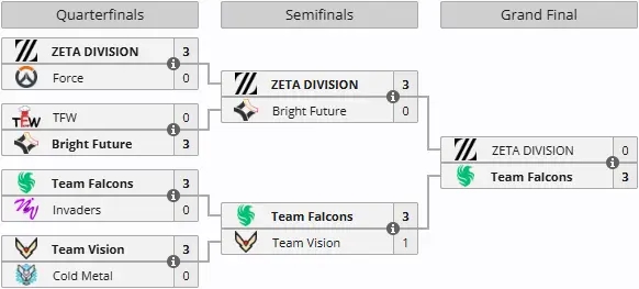 這個項目其實就更沒有什麼說法,畢竟這周進行的比賽連小組賽都不算,只是由8支隊伍單敗決出一個小組賽名額。最終兩支韓國戰隊會師了決賽,Falcons完勝ZETA拿到名額
