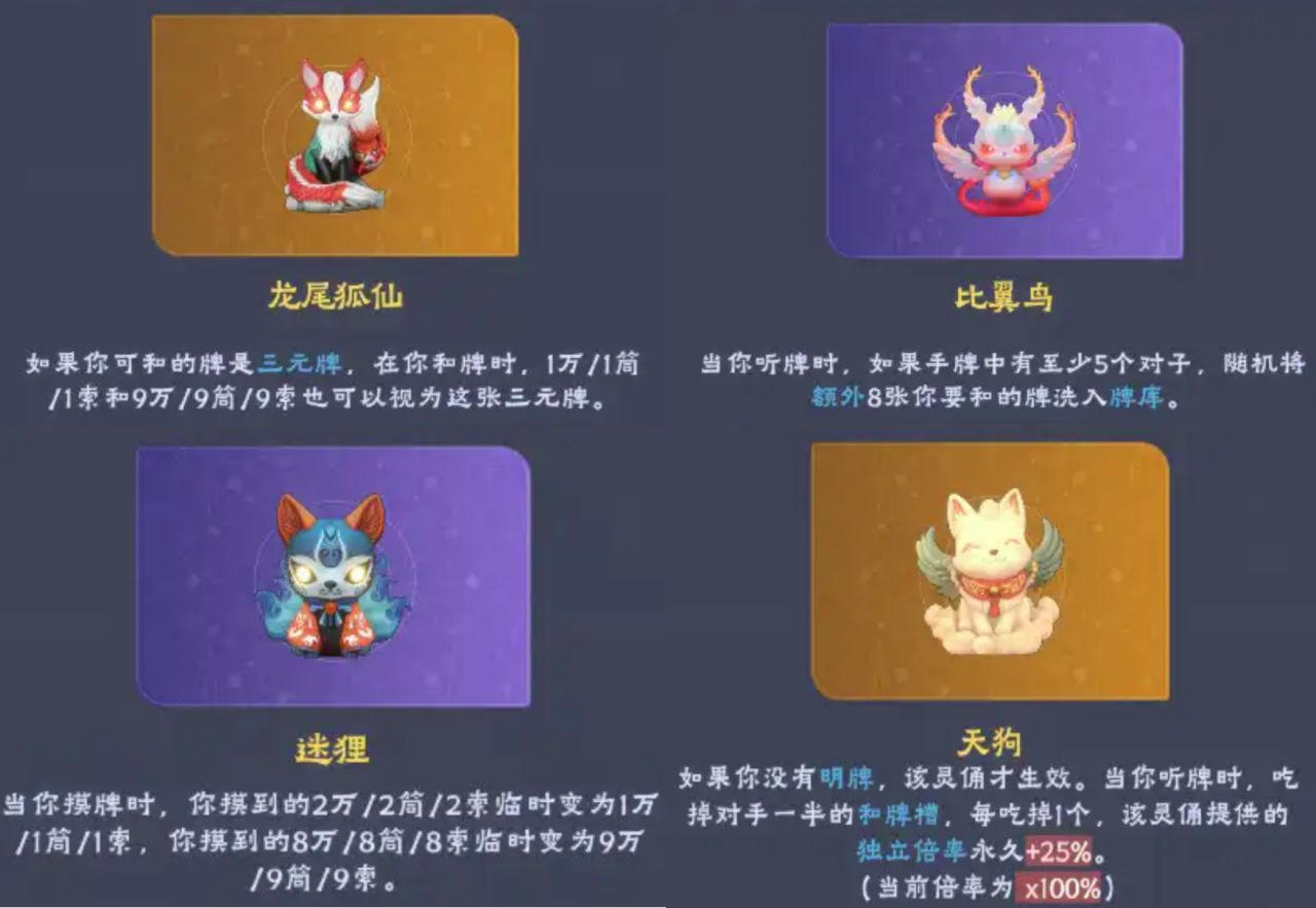 通過牌靈,將所有某一張牌改成另一種牌型,改變牌的構成。通過靈傭“青鸞”一次加入12張幺雞。在清一色方面,算靈狐仙、幼狐、風生狐和九尾狐可以讓我們喫/碰更多牌。