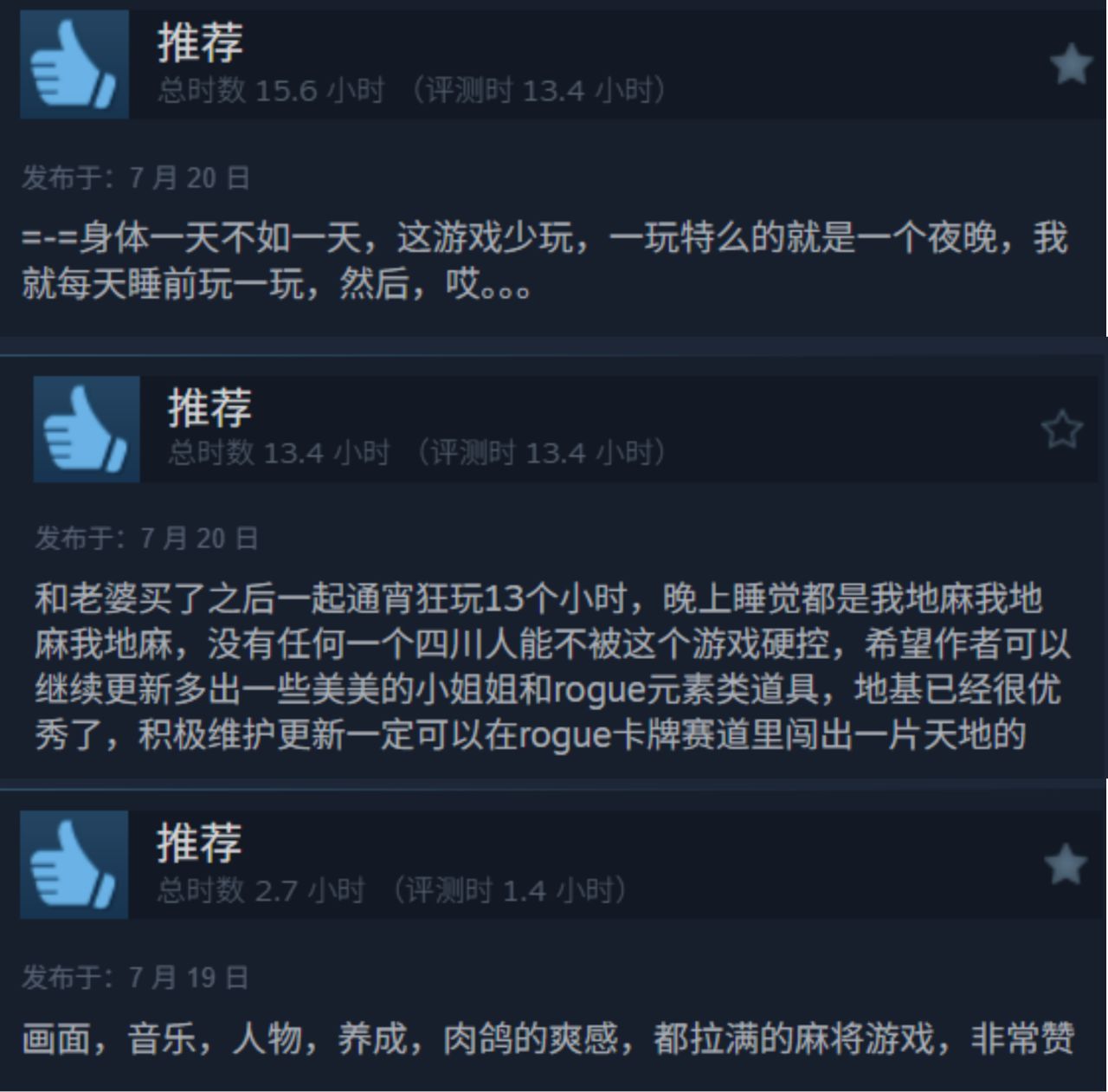 《我地麻》不只是麻將,更是款玩法創新、體驗有趣、質量優秀的肉鴿遊戲。不用當成傳統的麻將來玩,完全可以當成肉鴿遊戲來玩。遊戲Steam好評率高達95%,不僅有活(鬼娘)更有料(玩法)。