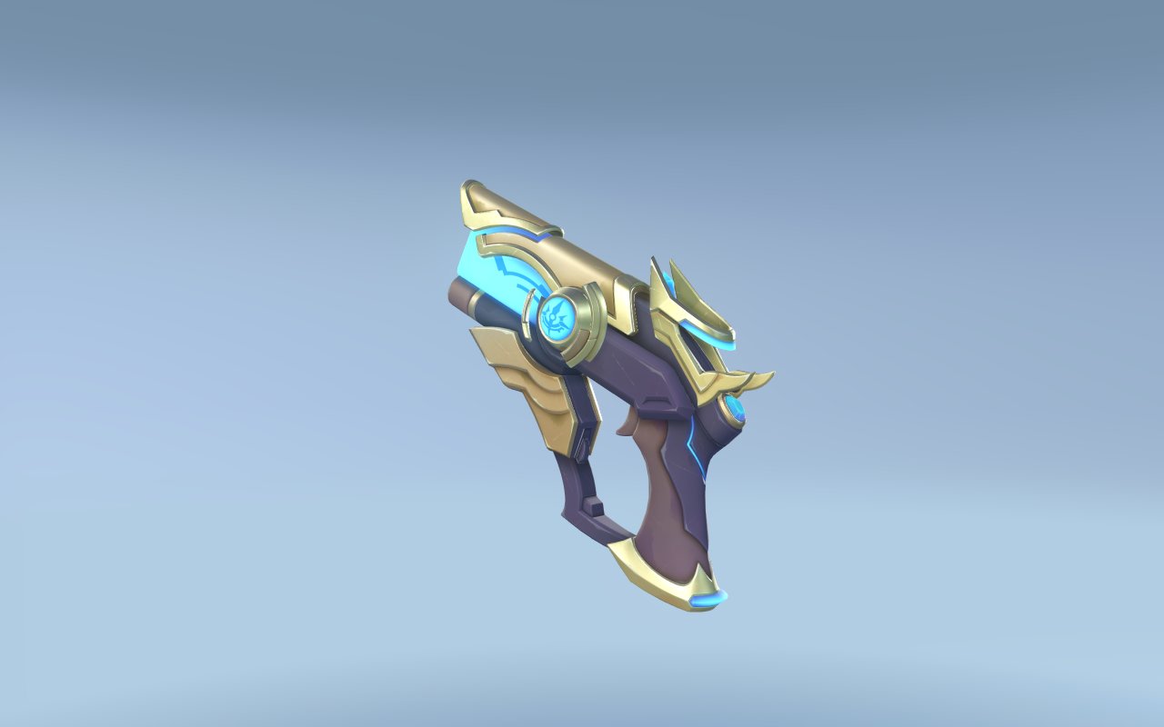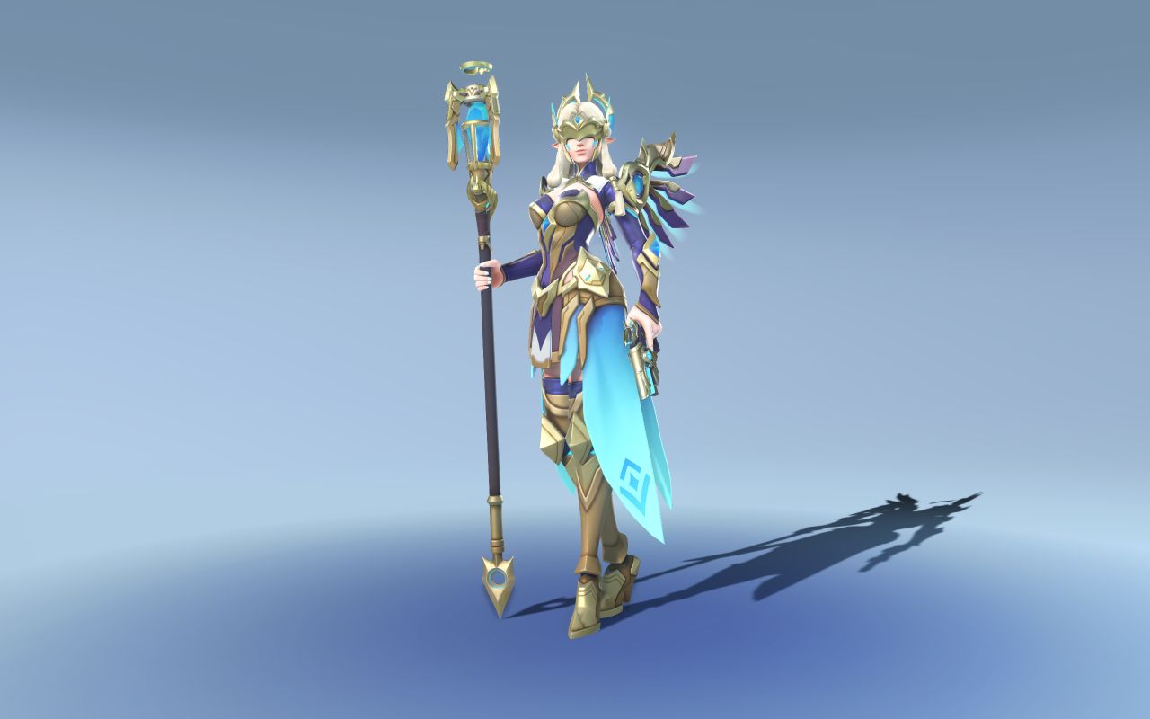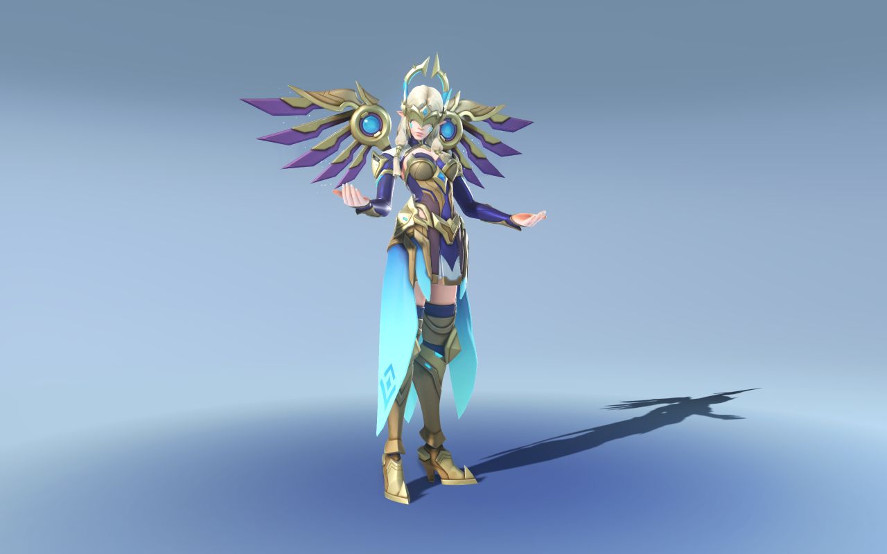 “聖輝天使皮膚靈感源自 TB Choi 的原創概念與故事背景。聖輝天使是來自平行世界的神聖存在,爲守護人類世界而降臨。爲體現這一設定,我着重傳遞神聖、溫暖與強大能量的視覺感受。閃閃發光的光環與眼罩凸顯其神性特質,同時通過花紋與主題設計喚起人們對先進平行世界文明的聯想。武器各處鑲嵌的藍寶石作爲能量導體,爲她引導治療之力與神聖能量。”