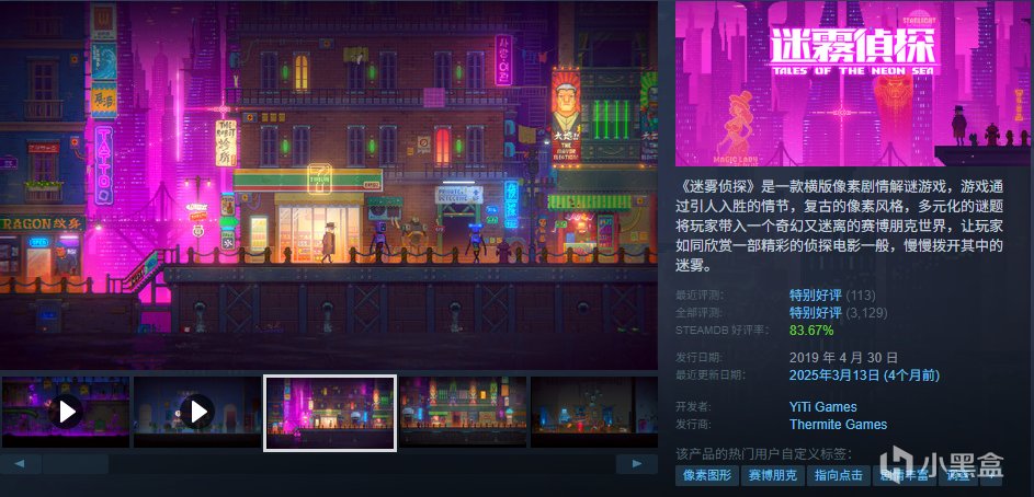 《迷霧偵探》是一款橫版像素劇情解謎遊戲,遊戲通過引人入勝的情節,復古的像素風格,多元化的謎題將玩家帶入一個奇幻又迷離的賽博朋克世界,讓玩家如同欣賞一部精彩的偵探電影一般,慢慢撥開其中的迷霧。