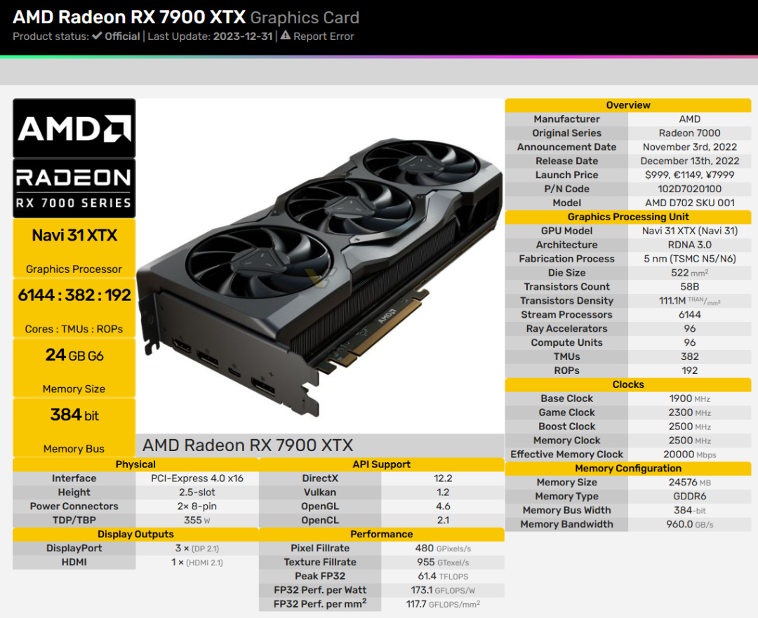 上一代旗舰RX 7900XTX基于Navi 31 XTX GPU,提供6144个SP流处理器,官方公版加速频率为2500MHz。如果AMD打算推出“RX 7950XTX”,那么只可能是在频率上做文章,因为不同于英伟达,AMD的旗舰级显卡已经给到了芯片的全部规格。