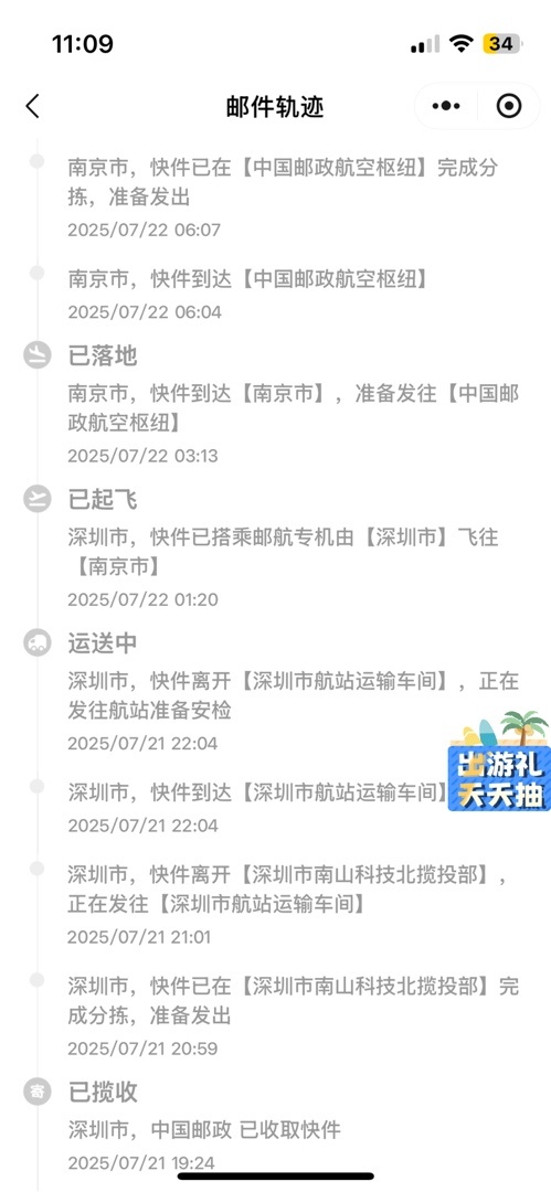 然后我就去检查了小程序,发现21号也就是我回成都的当天内地的ems就已经收件了,没错是ems走的空运,到了内地什么都快了,两天就能拿到你的卡片