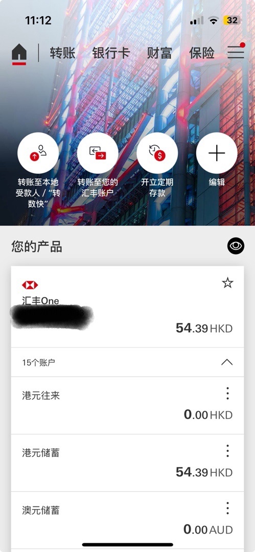接着你的汇丰one账号就会收到钱,但是这笔钱还不在你的银行卡里面,因为汇丰one把不同的币种分了不同的账户,我们刚刚转的钱在人民币储蓄里面,我们选择主页“转账至您的汇丰账户”,选择人民币储蓄,然后入账账户选择港元储蓄,输入金额,就ok了,接下来我们看到港元储蓄里面有了HKD的货币,说明这笔钱已经到我们卡上了