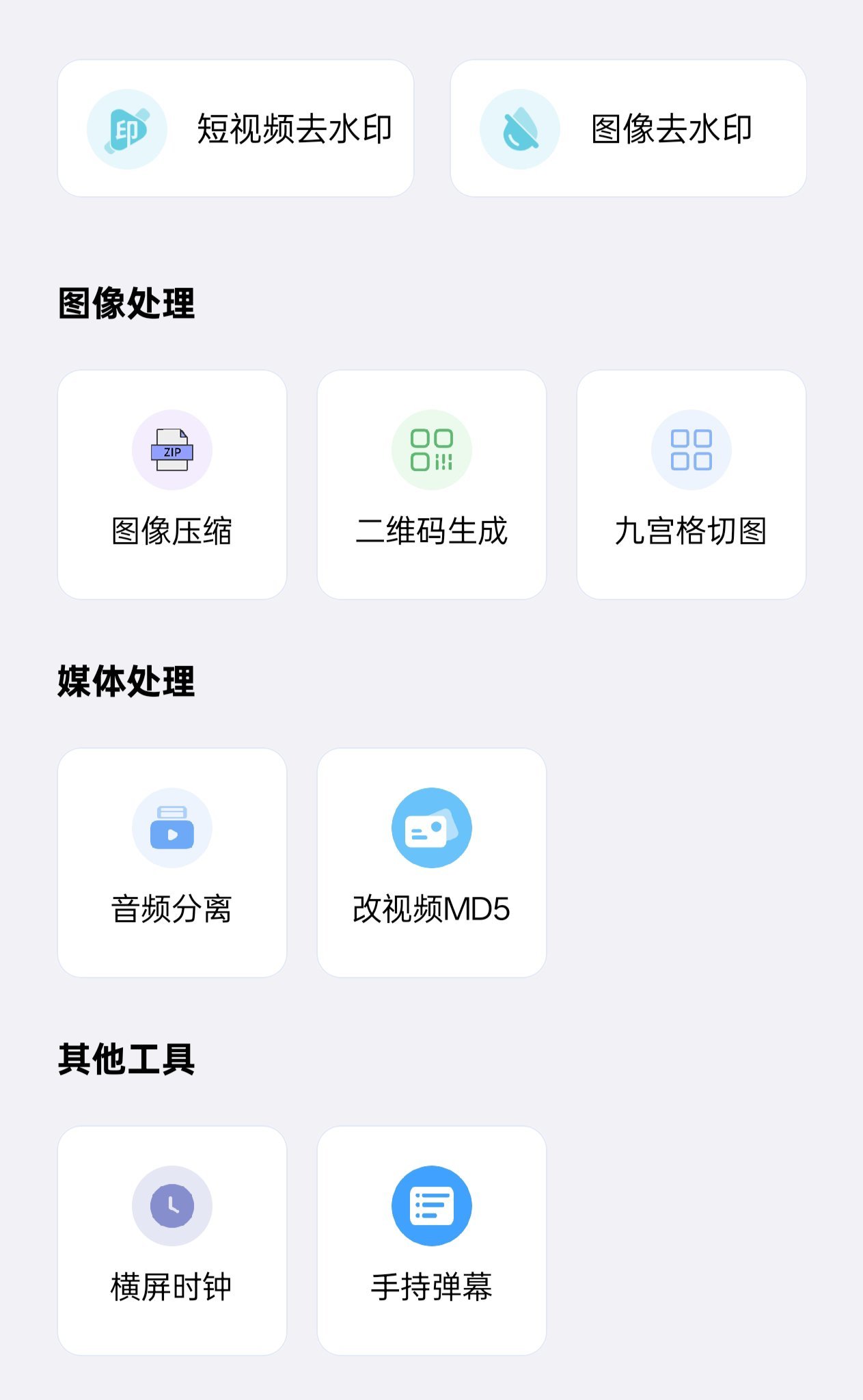 支持视频、图片去水印,以及图像压缩、二维码生成、九宫格切图、音频分离、手持弹幕等众多功能,且全部功能免费,画面简洁清晰。
