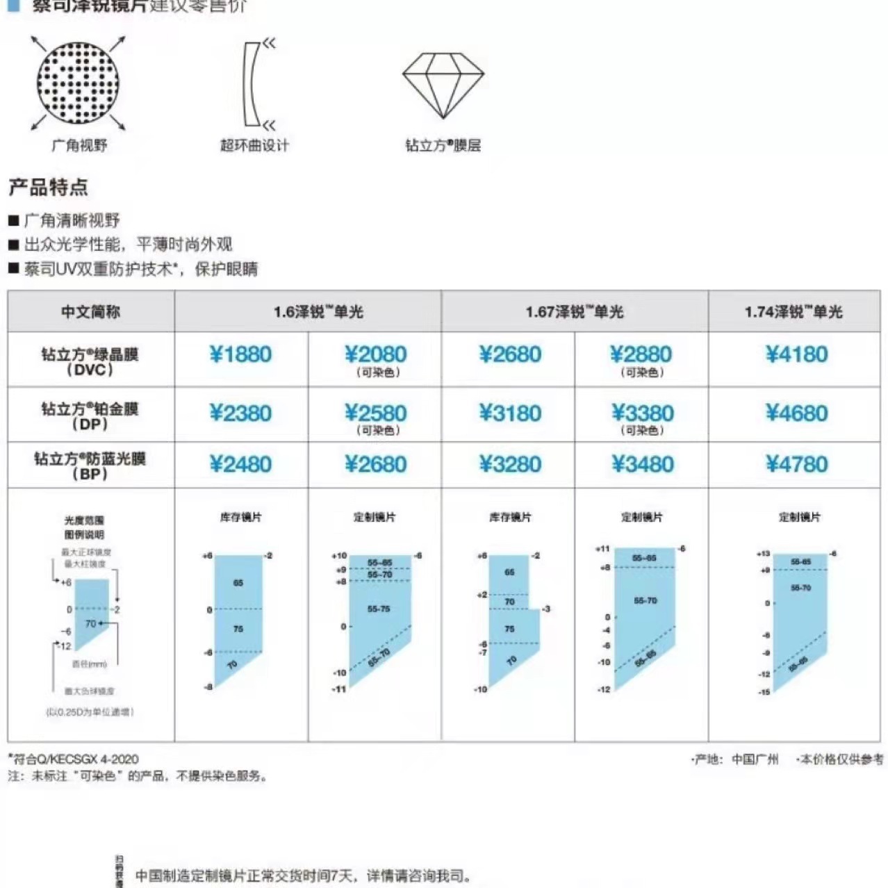 6.定制镜片,还有一些容易翻车的镜片(配之前先自己敲定选择范围,不要被店员引导着走。)不建议线上配镜,如蔡司的泽锐镜片(库存但是模仿定制镜片的设计)就有很多人不适应,线下配镜容易售后。