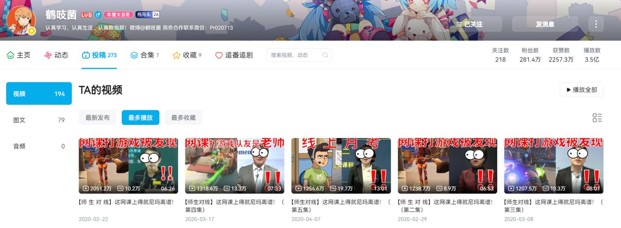 鹤吱菌,这位更是高手中的高手,()的时候火得一塌糊涂,用不要喂食猴子的画面,搭配了一个网课偷玩游戏的主题吸引了大量粉丝。听脚步真的是太经典啦
