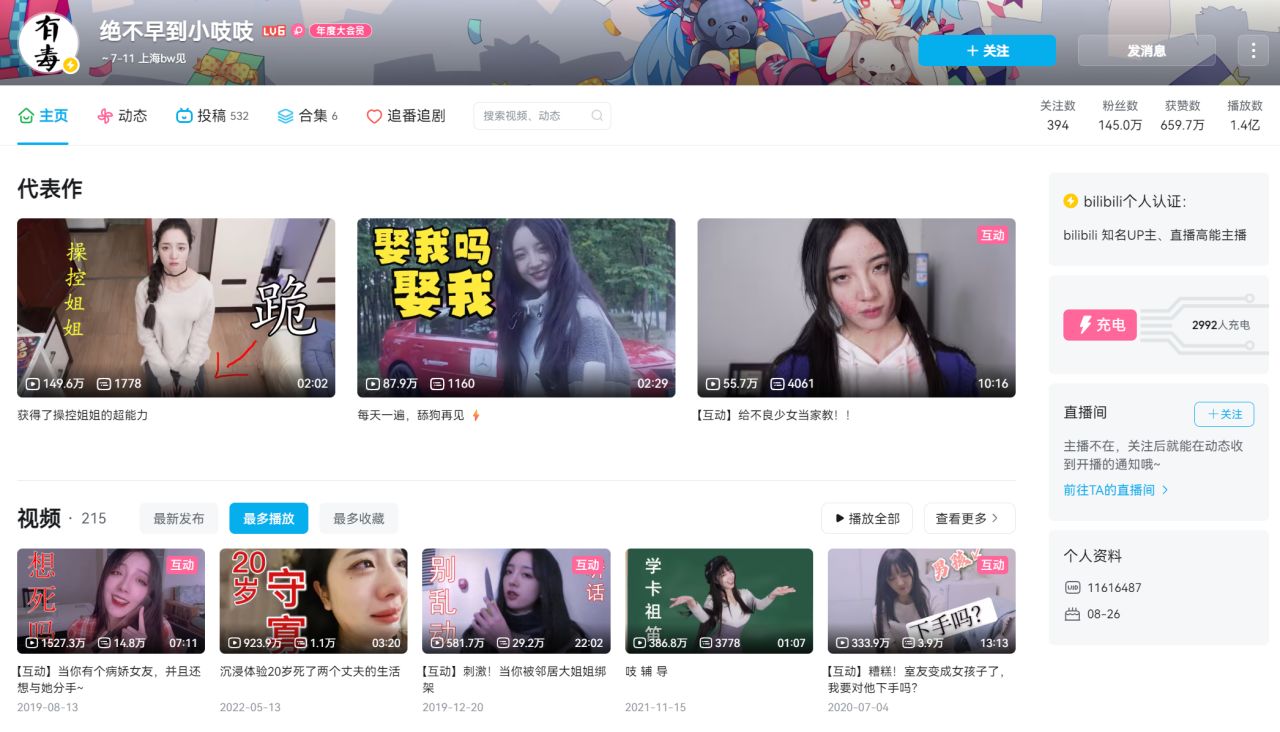 绝不早到小吱吱,也是我很早就关注的一个up了,当时是因为发现了b站的新大陆——互动视频。小时候就在想,哇塞,这也太酷了,一边玩一边看的视频,现在回头看感觉有些幼稚和无聊了