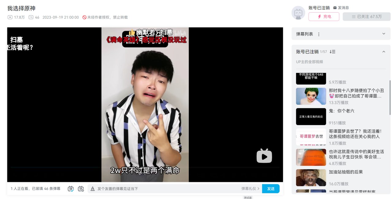 哥谭噩梦郝然,当时因为扮演小丑的土味视频和b站对他视频进行了大量才华横溢的的鬼畜剪辑(一句焯打天下)最后也是入驻了b站,结果后面因为人品问题塌房了,果然火了就会飘