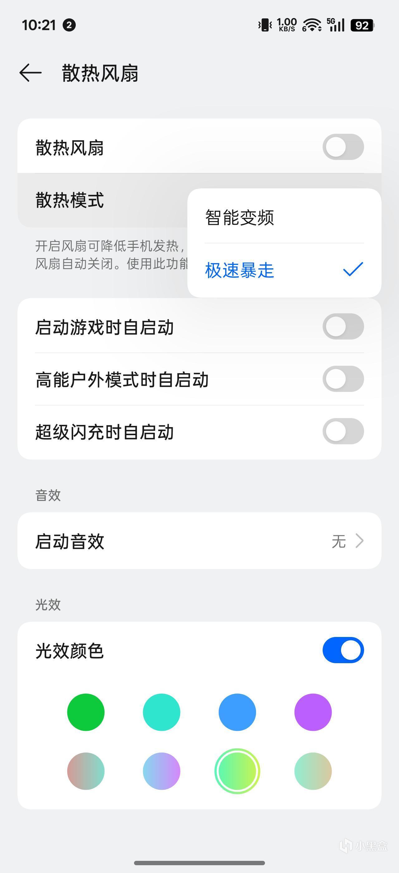 散热风扇支持智能变频(自动)和极速暴走(全速)两种模式,支持设置游戏时、高能户外模式、超级闪充时自启动,机身温度较低时会提醒你手动关闭风扇,如果这个改为自动的话体验就更好了。