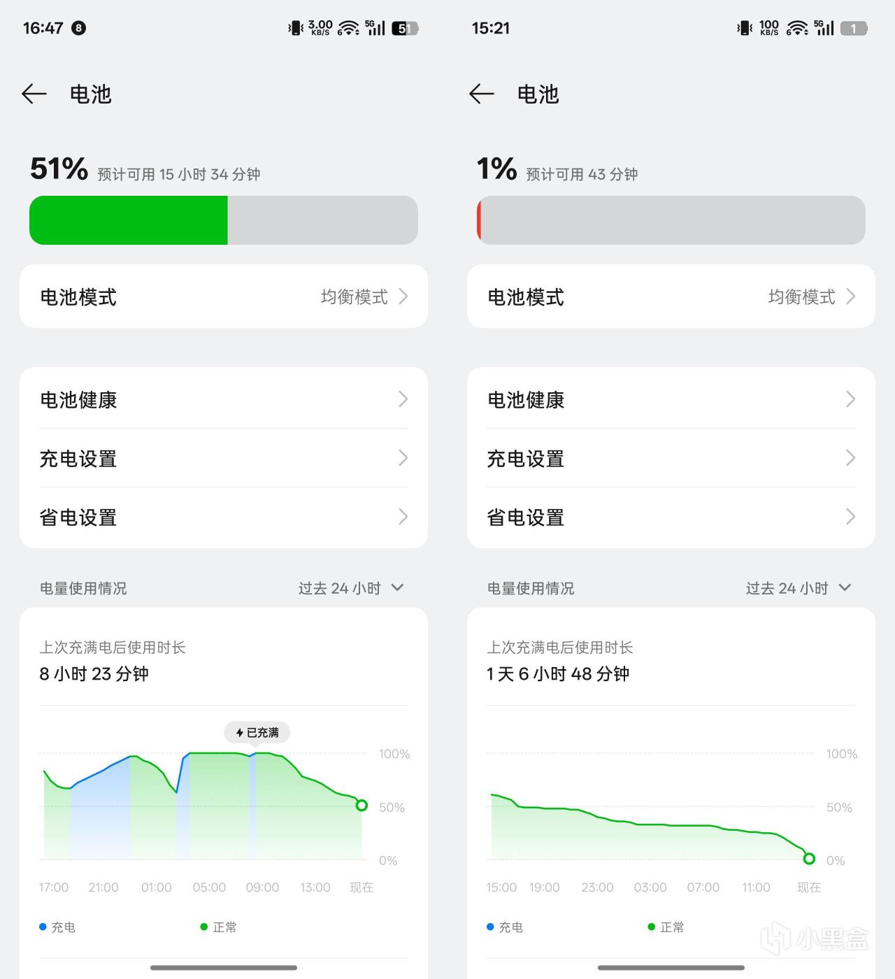 全程智能刷新率、FHD+超清画质、50%亮度、50%音量、单卡开启5G、连接Wi-Fi下,进行如下续航测试。 1小时30分钟长视频(哔哩哔哩) + 1小时30分钟游戏(原神、王者荣耀全高) + 1小时信息流App(15分钟知乎、15分钟微博、15分钟小红书、15分钟酷安) + 30分钟短视频(抖音) + 30分钟音乐外放 + 15分钟高德导航 + 15分钟微信视频 + 15分钟微信语音 + 15分钟微信聊天朋友圈 + 10分钟电话通话 + 5分钟淘宝购物 + 5分钟美团 + 5分钟1080p@60fps视频录制 + 5分钟拍照,共计6小时30分钟,剩余电量51%。