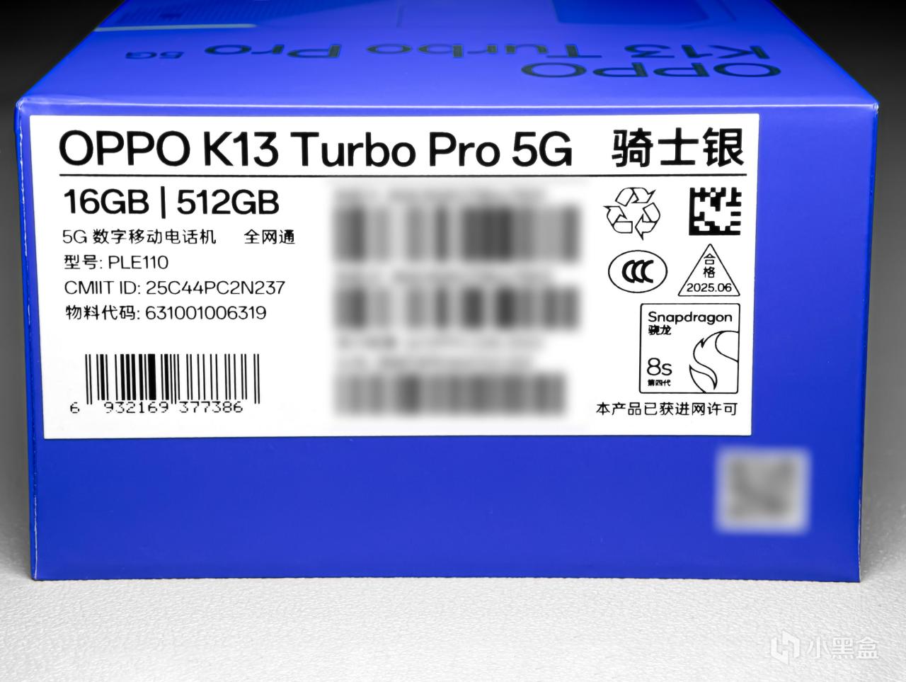 OPPO K13 Turbo Pro型号为PLE110,侧面产品信息贴纸印有第四代骁龙8s的标,我这台是骑士银的配色,2025年6月生产。