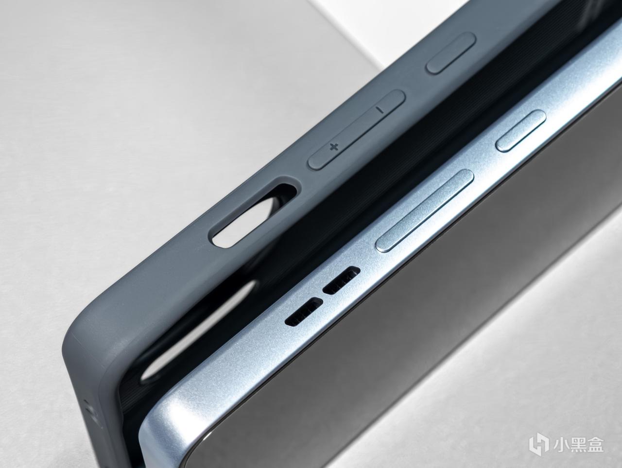 机身右侧与入风口相对应的位置便是出风口,略有斜角的锋芒机甲感,下方是常规的音量键和电源键。保护壳相对应的位置有开孔。
