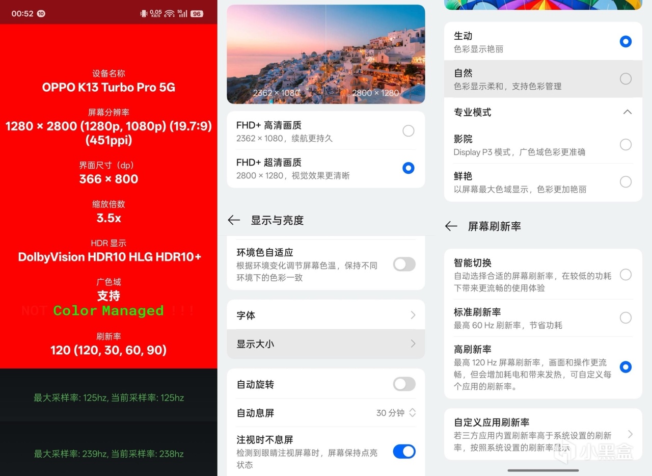 这块屏幕给到了平衡清晰度和功耗的1.5K分辨率(2800 × 1280),刷新率最高120Hz,智能 / 标准(最高60Hz) / 高刷新率(最高120Hz)三档可选,高刷新率下支持自定义高刷应用。App映射给了30/60/90/120Hz四个档位。