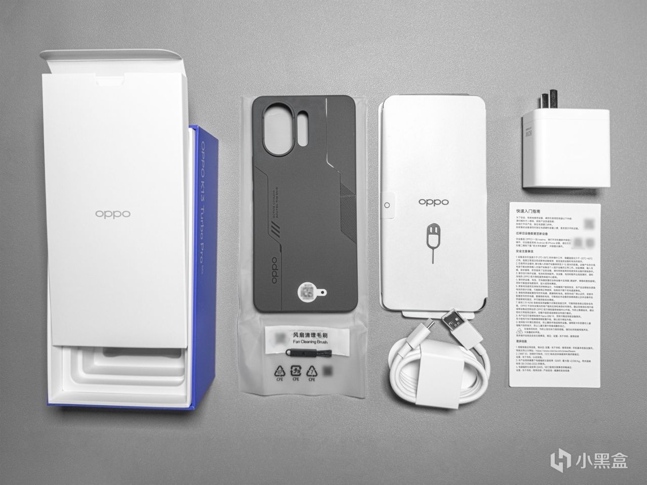 包装盒中包含OPPO K13 Turbo Pro手机、充电器、数据线、取卡针、保护壳、快速入门指南,此外还有一个小毛刷,便于清理风扇。