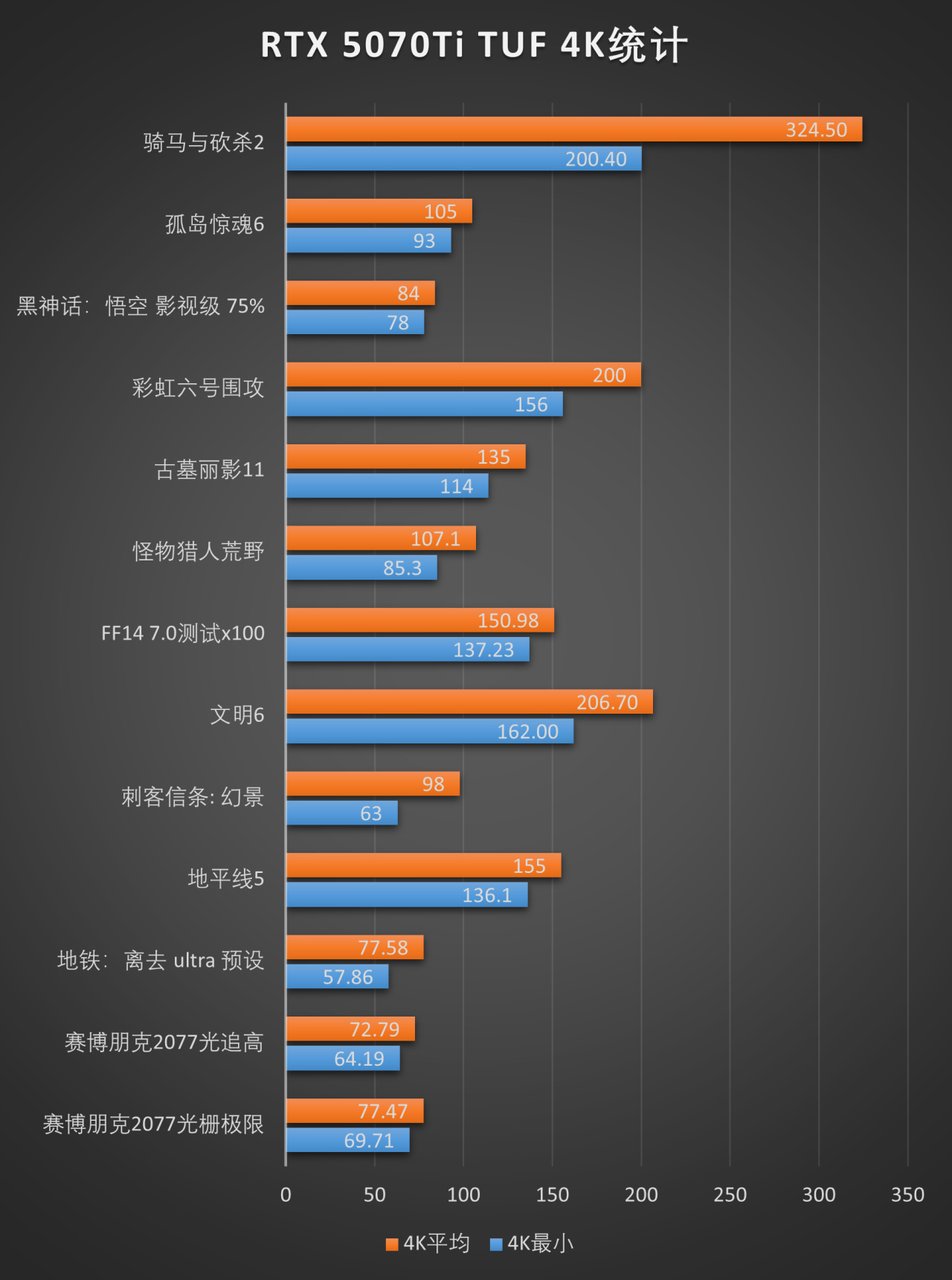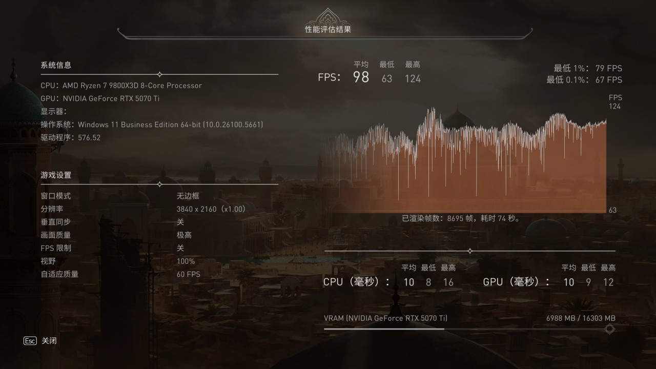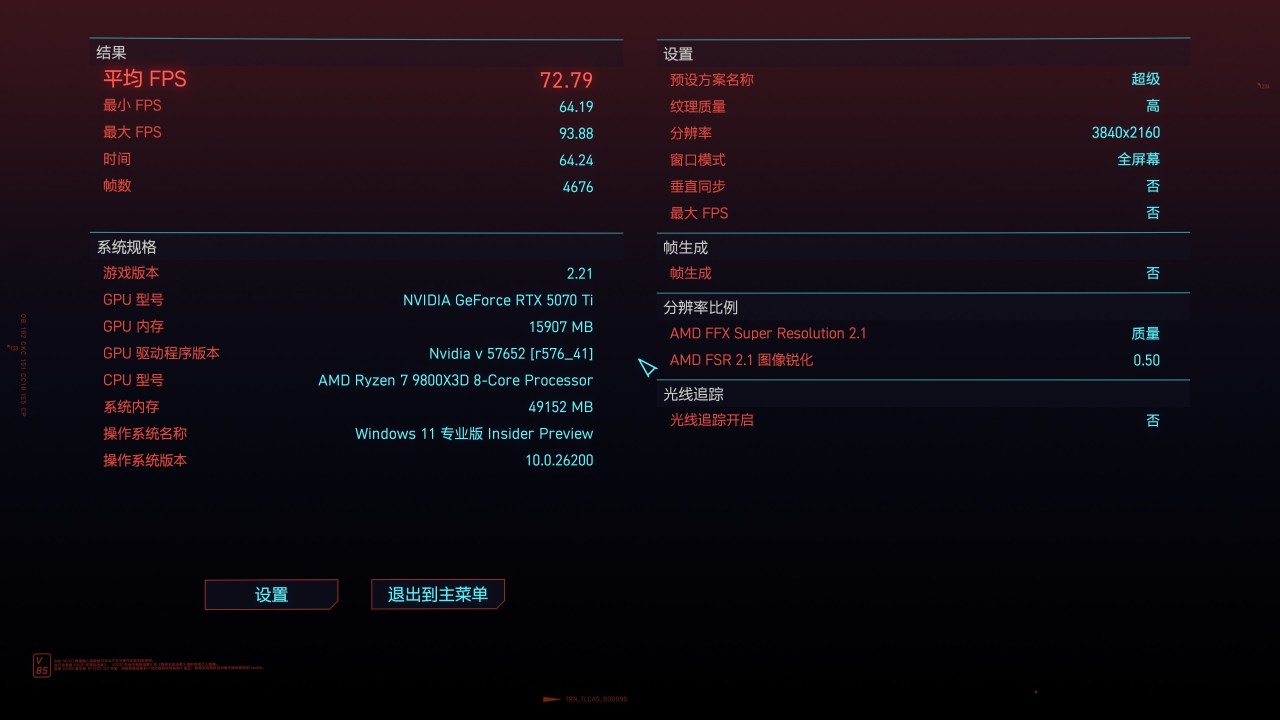 下面是游戏测试,所有的测试都是4K下执行的,毕竟5070Ti这个性能和显存都是4K级别的,就不跑1080P这些屈才了哈哈。不过游戏测得很多,我这里就不直接放全部的截图啦,整理好的成绩放在后面,有一个汇总。