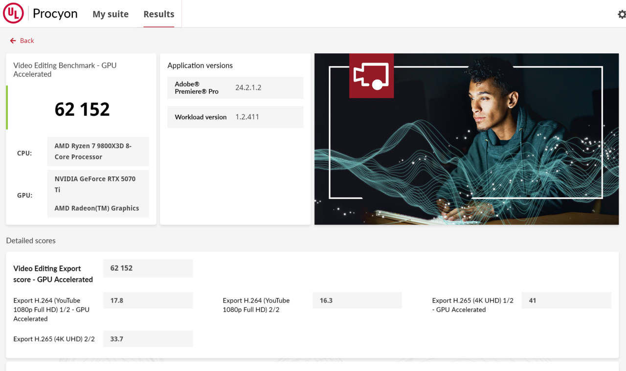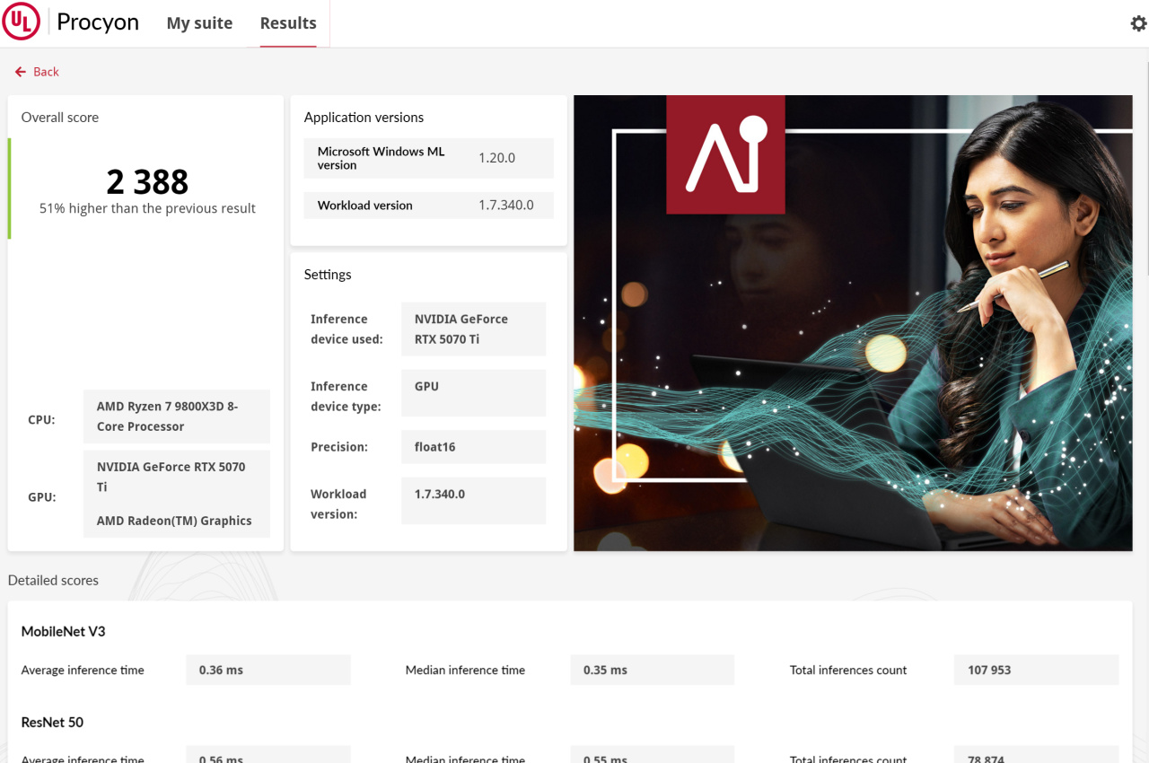 下面是Procyon的生产力和AI测试,N卡这一代更新了编码器,所以视频编辑比上一代还要强。5070Ti的核心跑AI也是不错的