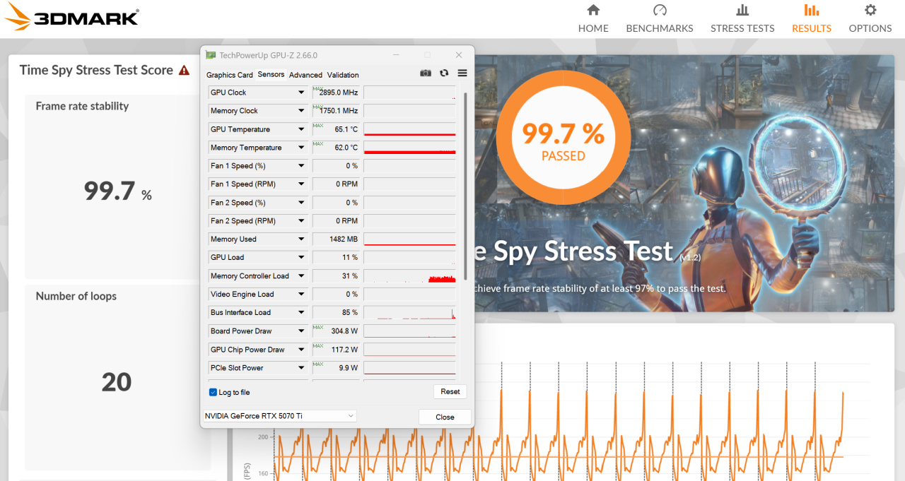 首先来测试一下烤鸡,TUF的散热非常给力,这张显卡的功耗达到了305W,但是温度烤鸡只有65℃,显存温度更低,此时的风扇速度不到30%,完全不构成压力。