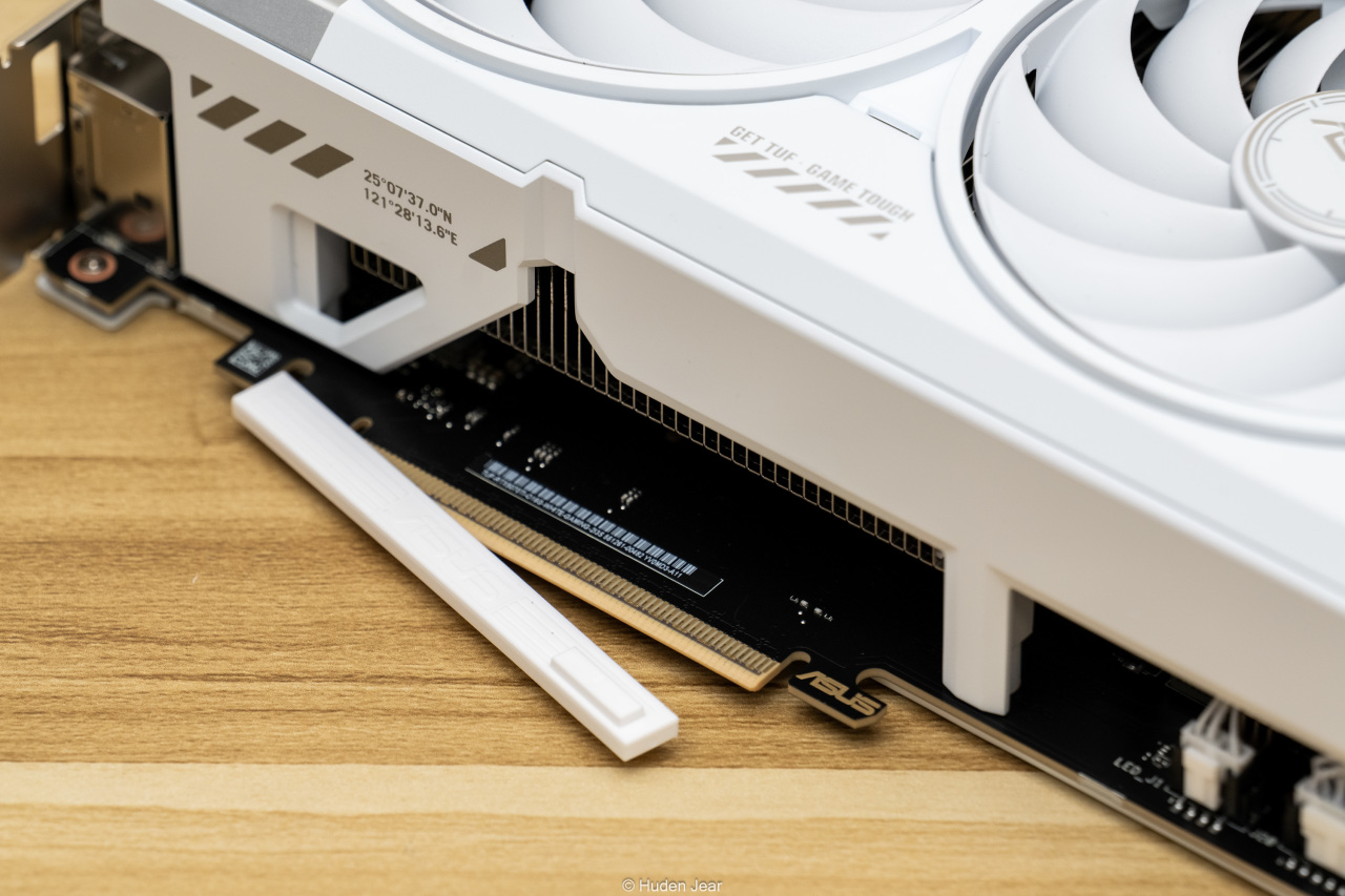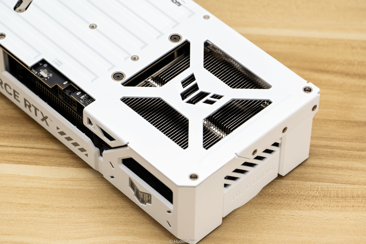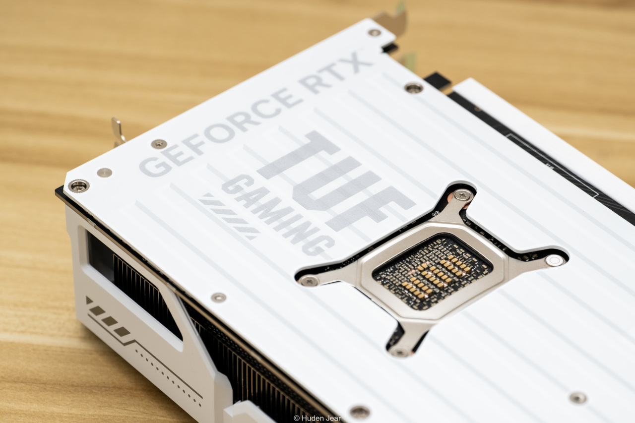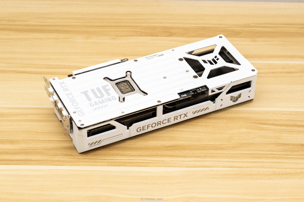 显卡的背板也是纯白色,金属背板基本完全覆盖,并且在散热区域做了镂空保证效果。背板上有TUF的logo,还用纹饰做了凹凸的视觉效果,因为显卡安装之后大部分时间都是看背板,所以我觉得背板做精致一点就正好。在显卡的核心区域可以看到金色的MLCC电容,做工用料非常不错
