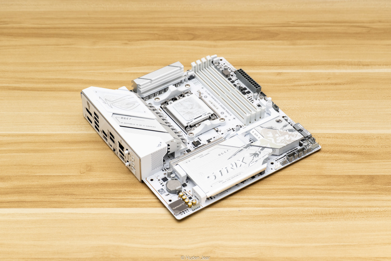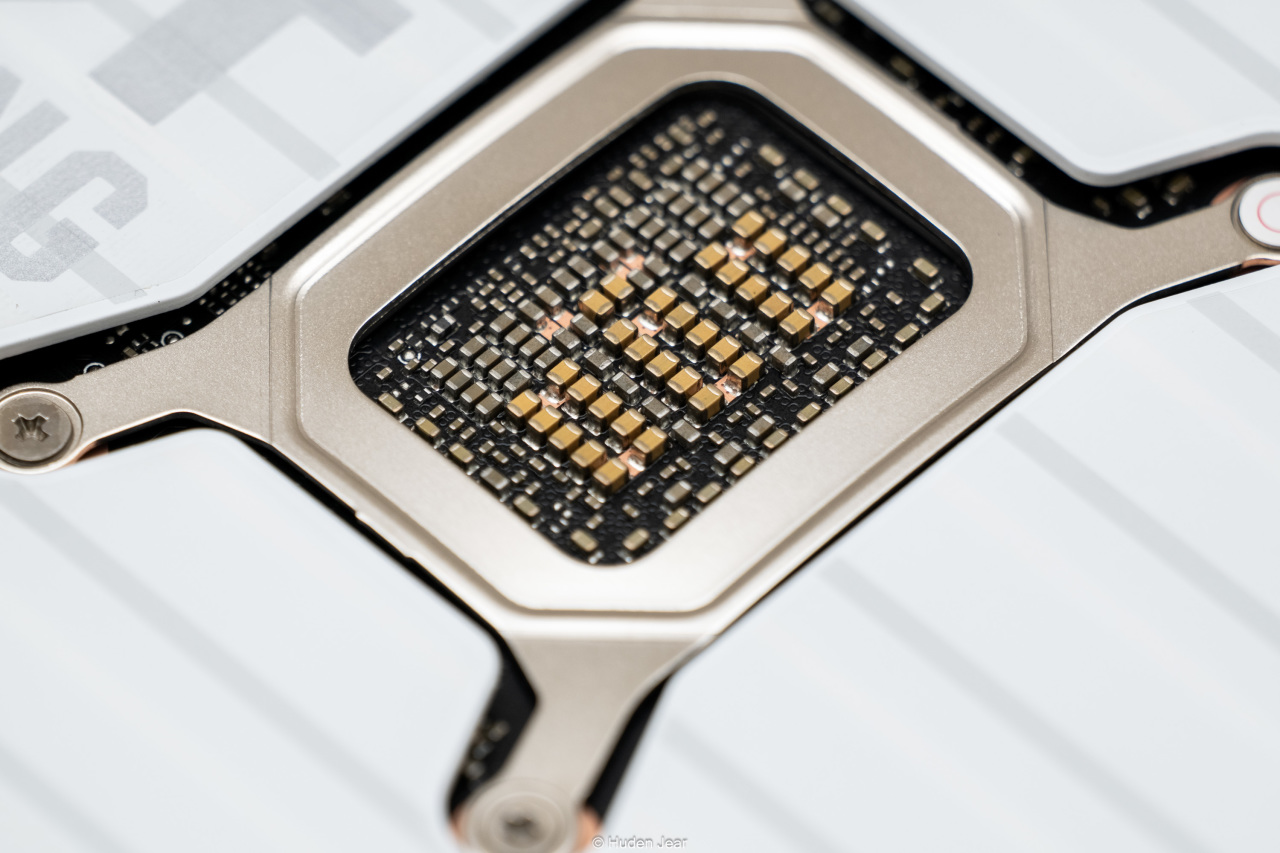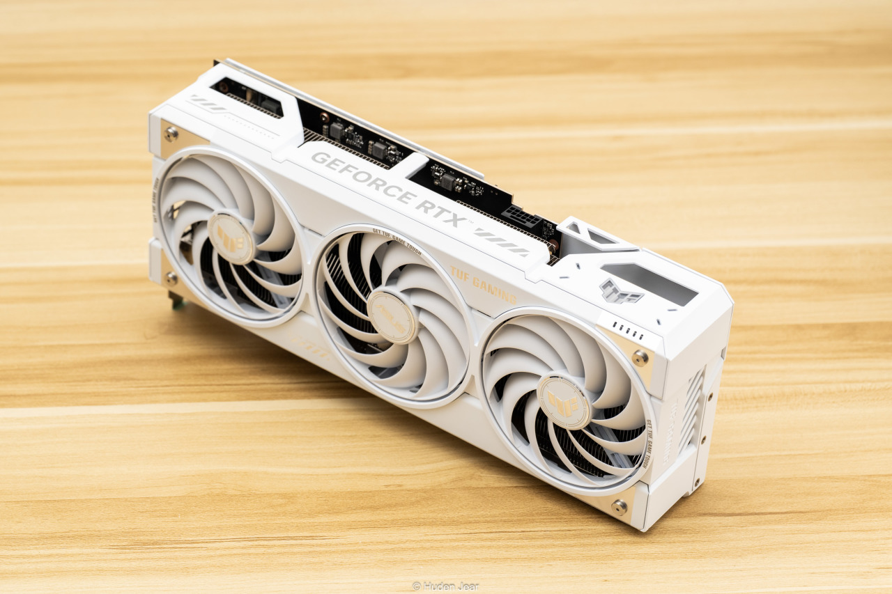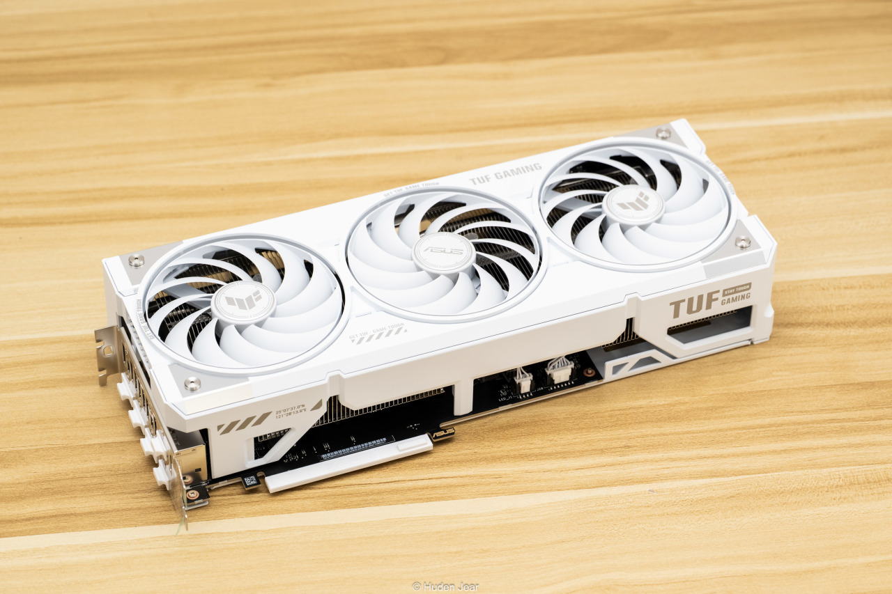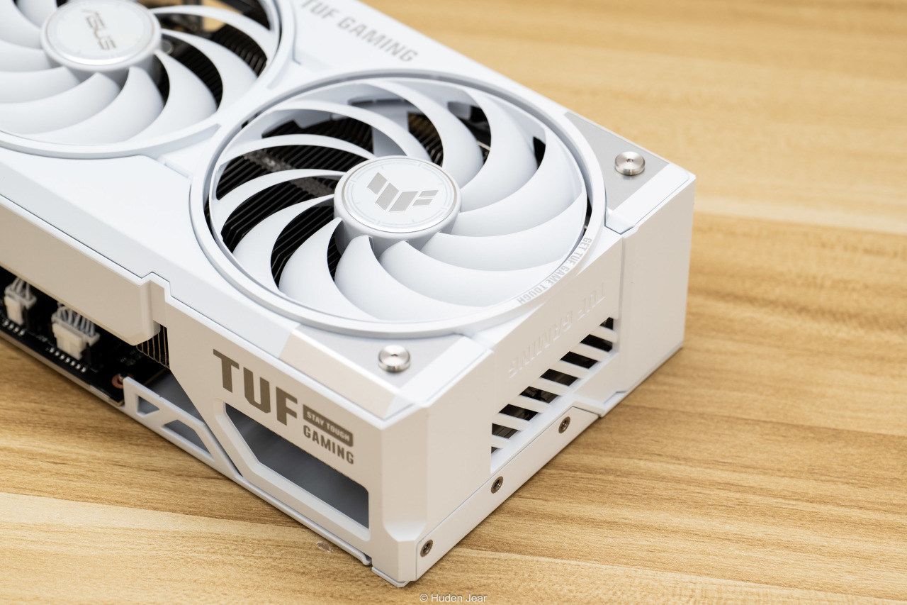 显卡的背板也是纯白色,金属背板基本完全覆盖,并且在散热区域做了镂空保证效果。背板上有TUF的logo,还用纹饰做了凹凸的视觉效果,因为显卡安装之后大部分时间都是看背板,所以我觉得背板做精致一点就正好。在显卡的核心区域可以看到金色的MLCC电容,做工用料非常不错