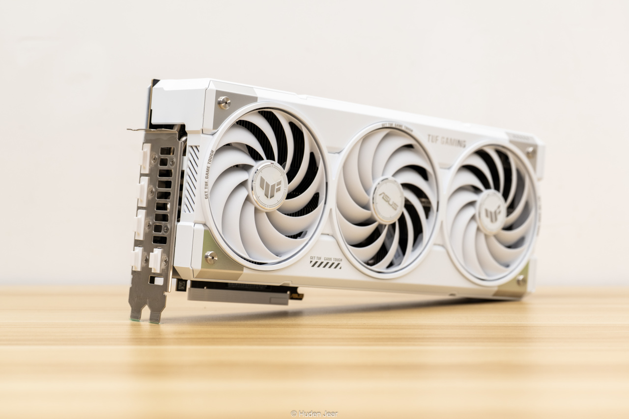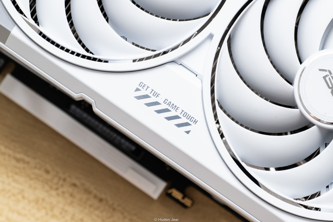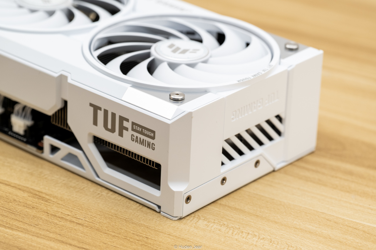 测评的显卡是华硕最新的白色TUF RTX 5070Ti O16G,这张显卡有着TUF的系列外观,不过外壳改为了银白色,成为了目前与白色Astral并列的另一个白色系列显卡。背面有华硕显卡惯常的特性介绍,这张卡也是三年质保,不用担心售后