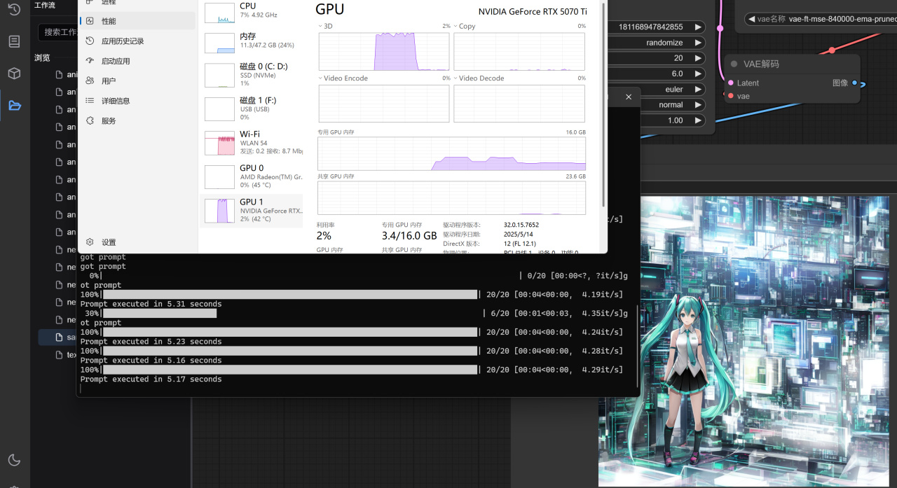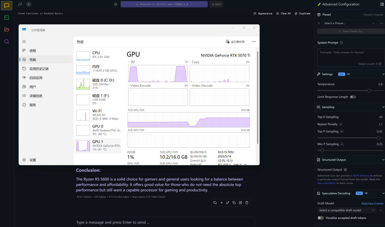 下面是一些AI应用的实测,大语言模型这一块,7B的deepseekR1可以跑上118tps,生成速度已经快如闪电了,如果是14B也有60tps的速度,也比联网版快不少。AI绘画默认的512x512的大小20iter,只需要1s就能跑完一张图,如果扩大到1024x1024 20轮,大概是4s跑完,这速度比我之前用的3090Ti还快了