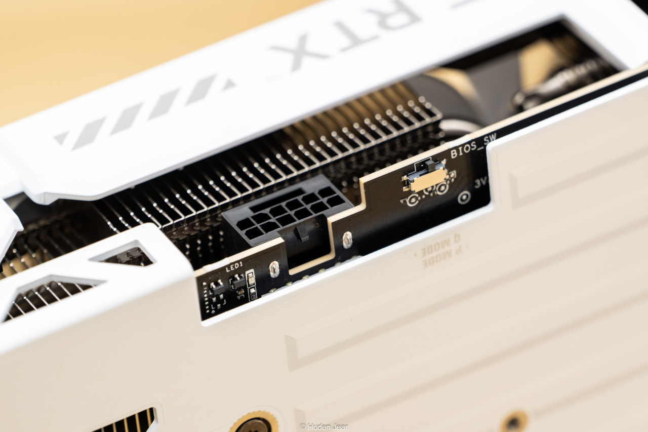 显卡肩部的TUF标志是可以发光的,效果做得很好。而供电接口使用的是新一代的12VHPWR,供电可以支持最大600w的输入,即使要超频也完全不在话下,不过显卡本身就是OC的,我觉得没有太大必要。TUF RTX5070Ti o16G还提供了双bios切换,默认性能模式,还有静音模式可供选择。