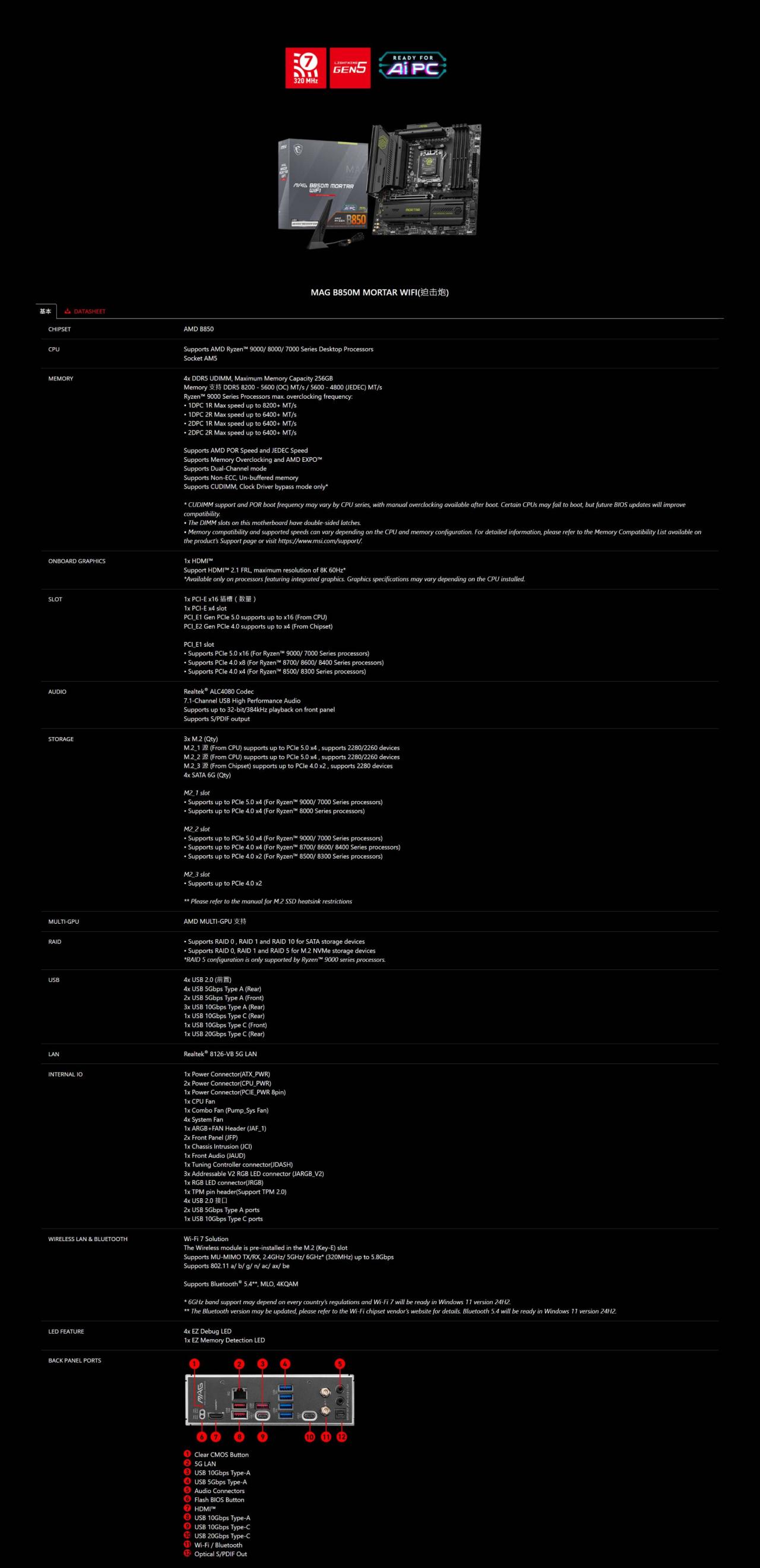 老样子,列一下微星B850M迫击炮WIFI这张主板的基础硬件参数: