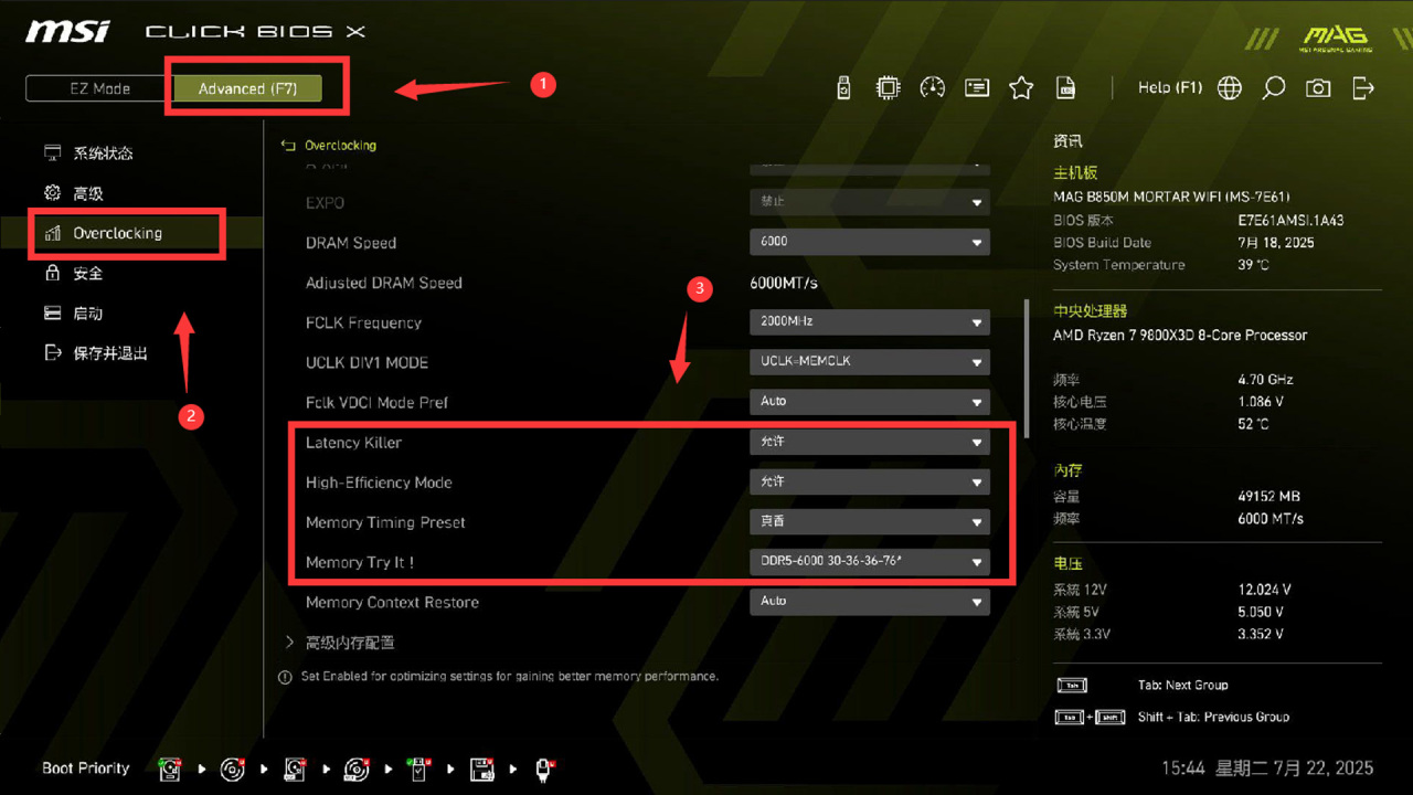 ● Memory Try It!改为6000MHz+C30,开启Latency Killer和High-Efficiency Mode。