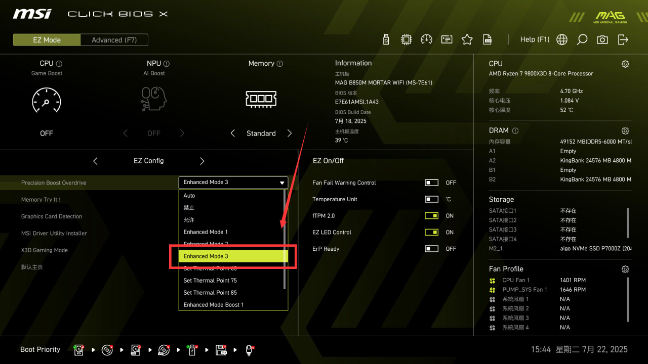 修改也非常简单,BIOS主页面点击Precision Boost Overdrive,将模式切换成Enhanced Mode3即可。