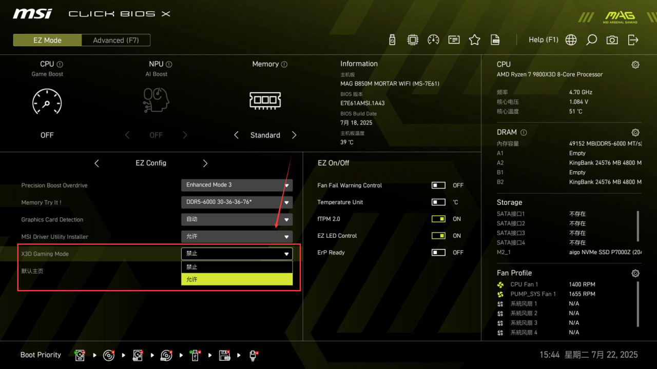 如果玩CS和无畏契约这种网游为主,可以在BIOS首页开启X3D模式,部分游戏可能是负收益,具体以实际帧数为准。