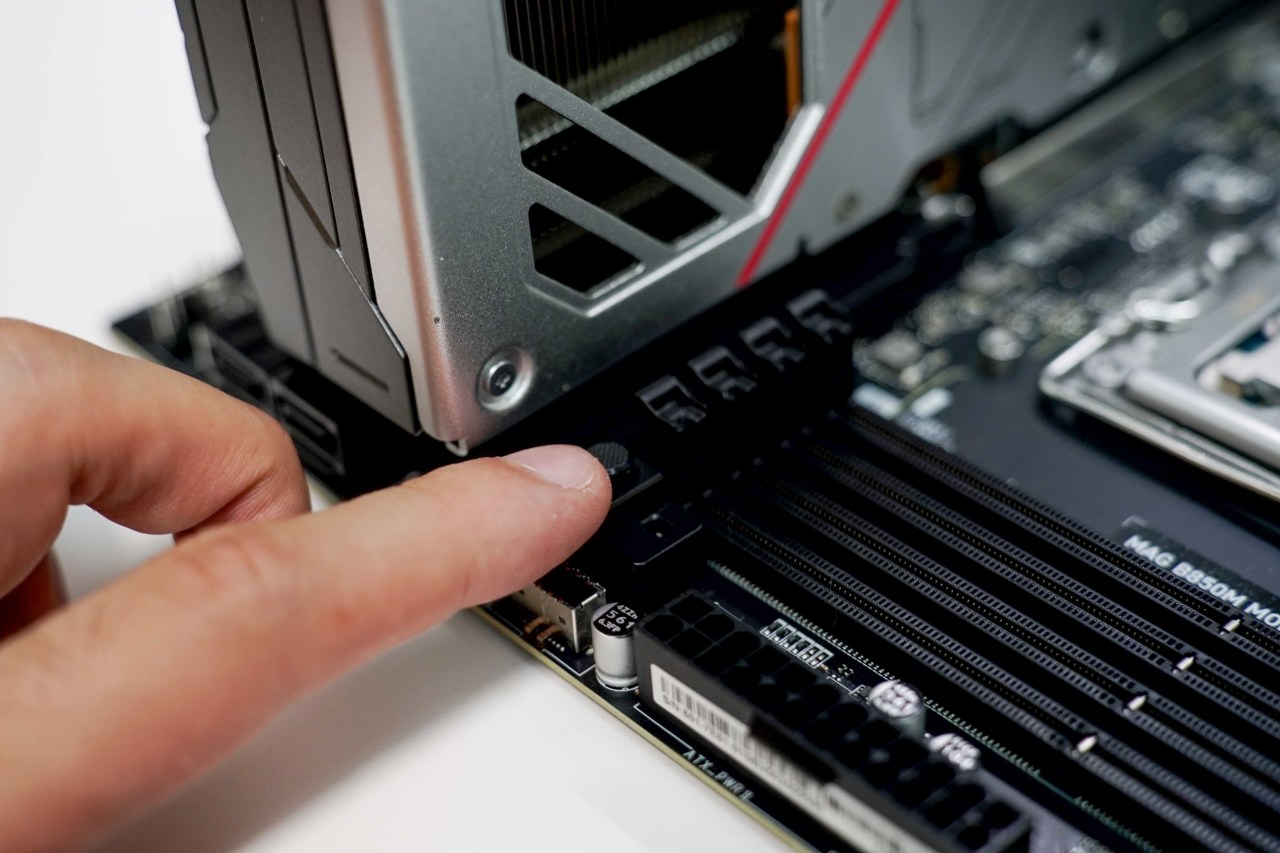 微星B850M迫击炮WIFI的主PCIe槽同样有辨识度,除了有合金加固以外,增加了独立的EZ PCIe快拆系统,紧凑型装机不用再拿螺丝刀捅了。