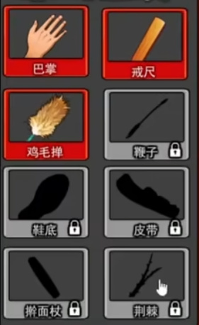 而人与动物最大的区别所在,就是人类还会使用工具,随着关卡的推进,游戏会解锁更多花式打屁股工具,拖鞋、擀面杖、马鞭、鸡毛掸子……