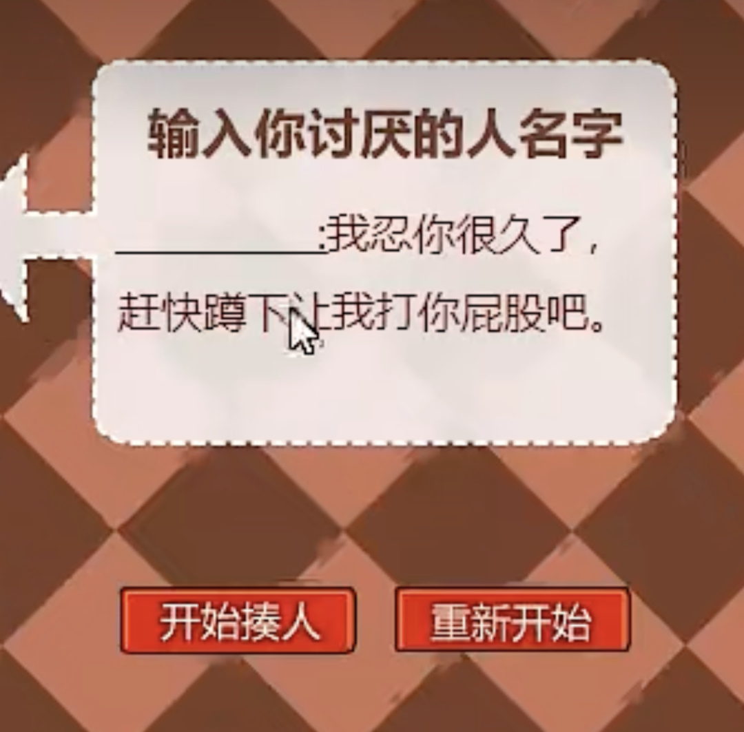 当然,如果你愿意的话,还可以将小人的名字改成自己讨厌的那个人,让自己的仇人在你的巴掌下瑟瑟发抖,发出一声声求饶。不过对于小孩子来说,真正讨厌的人可能也不多吧,最多就是把自己老师的名字写上去,现在想想还真是羞耻啊。