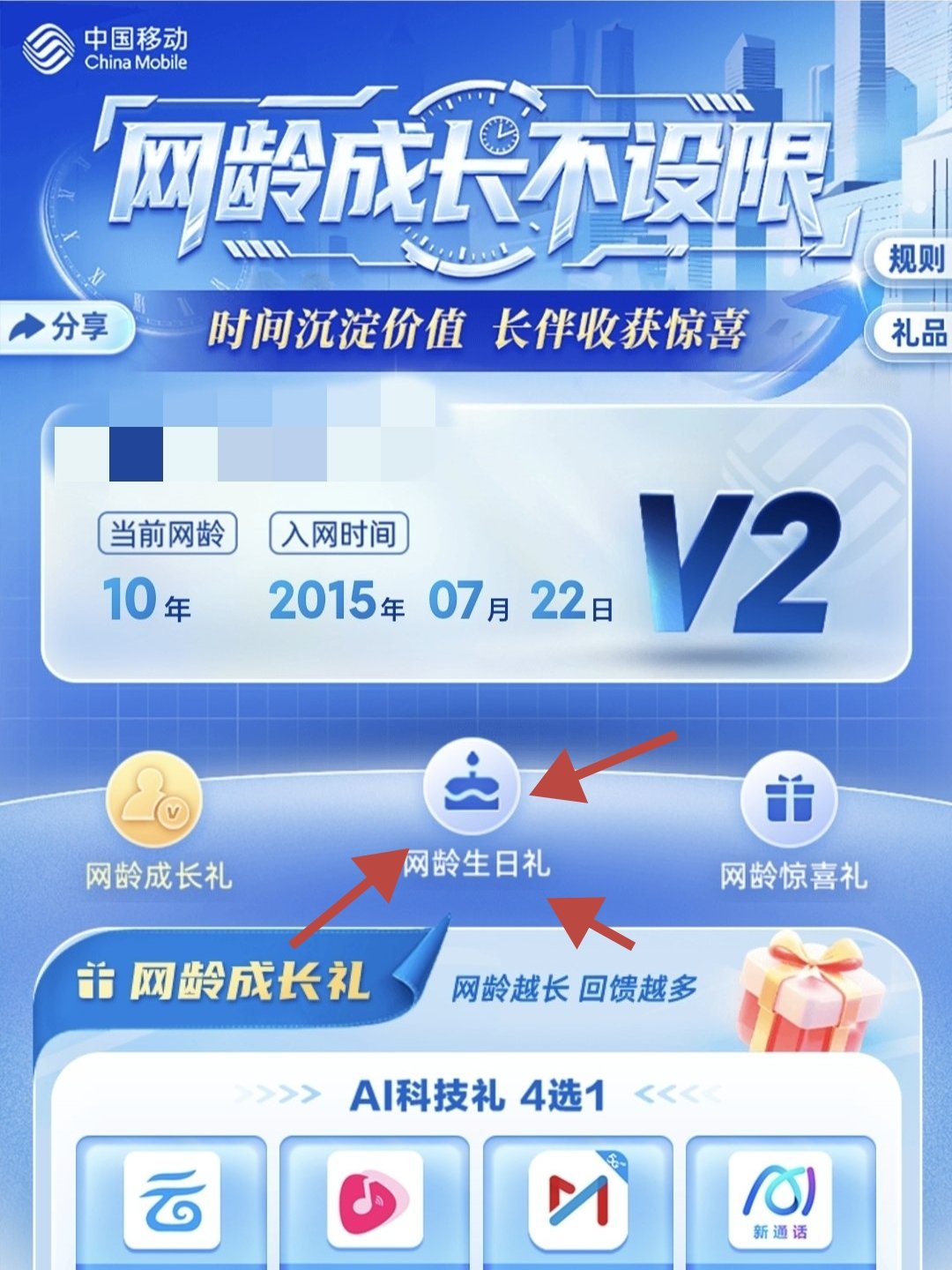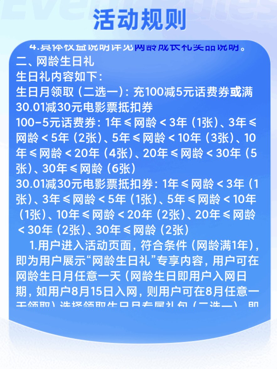 再點擊網齡生日禮,會出現100-5的手機話費券和30-30的電影票券,我的入網時間是7月所以我這個月就可以拿券