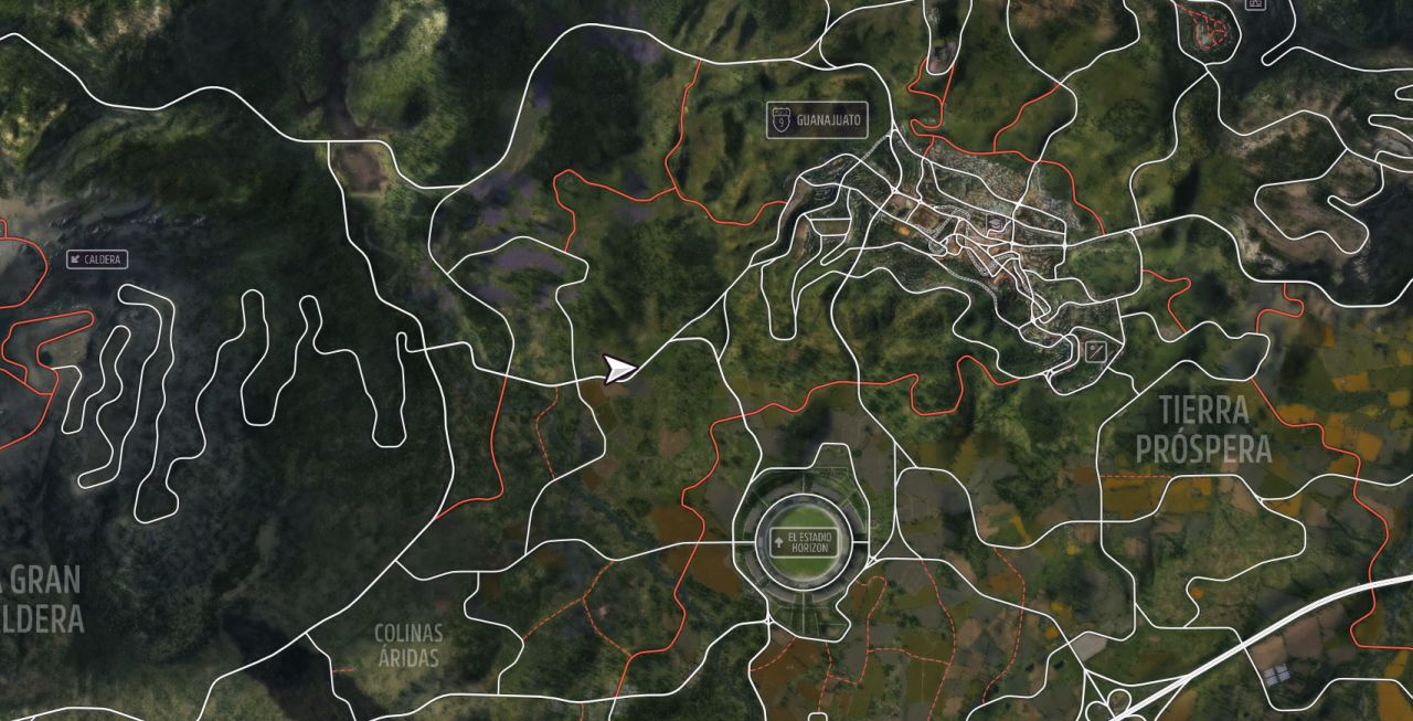 地平線 2 嘉年華場地的位置參考上圖,在體育場西北角的平原上,靠近直達瓜納華託城的公路。