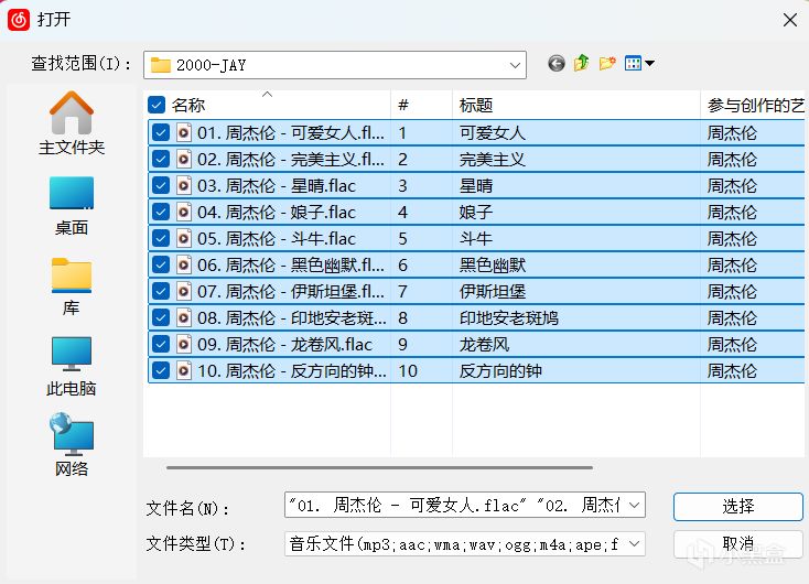 点击中间「上传」按钮,选择本地周杰伦专辑文件。