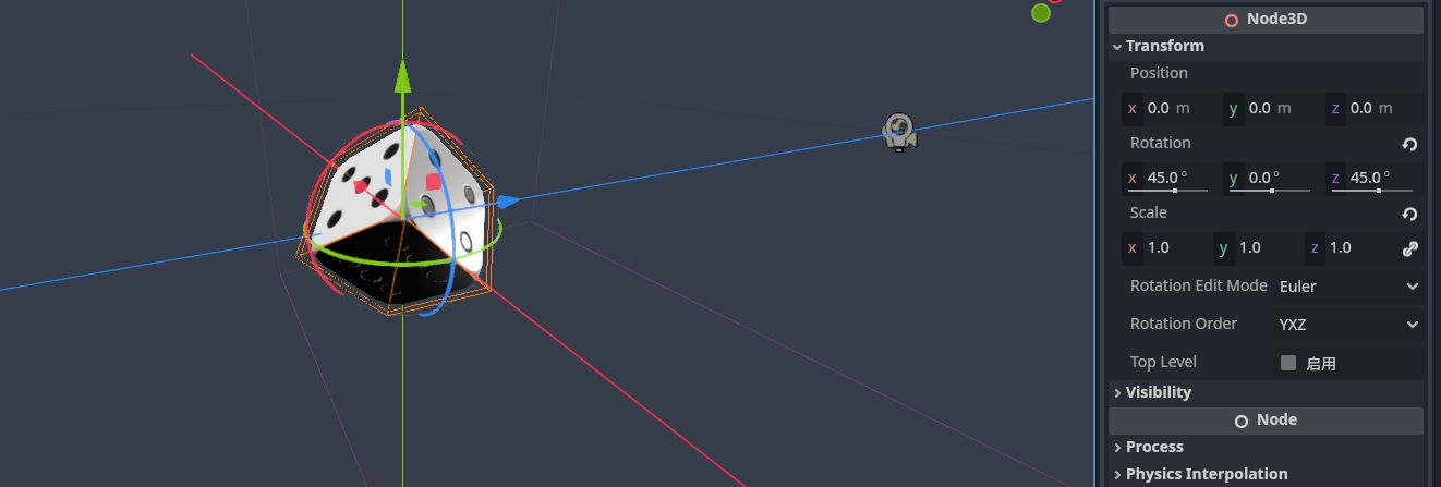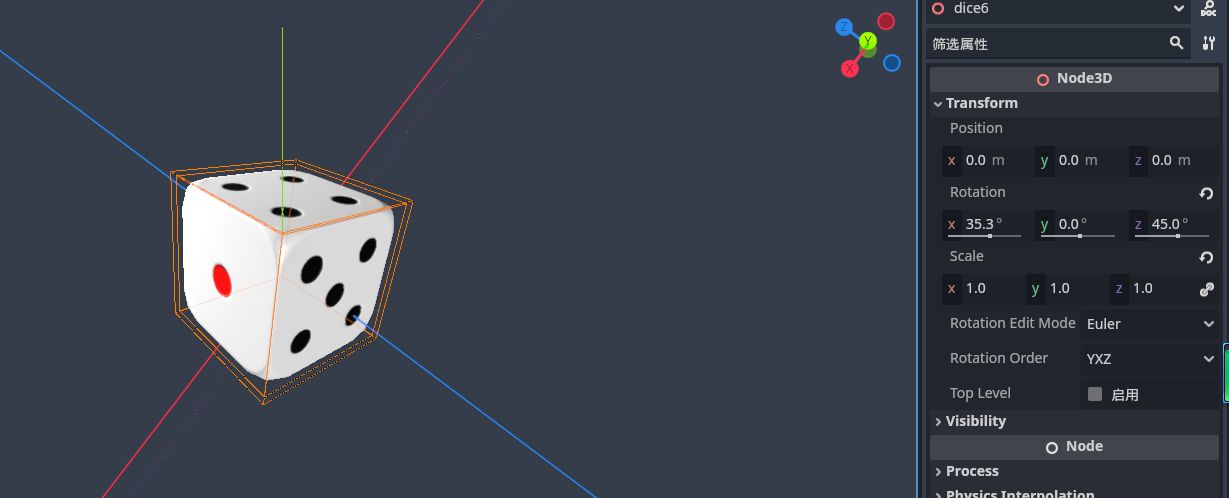 當我把骰子的角度改爲X 45° Z 45°時,令人疑惑的一幕出現了……骰子變成了偏心旋轉!