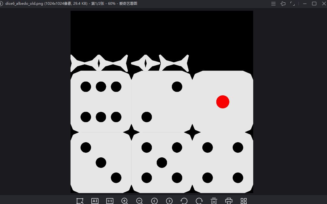 定製骰子貼圖的時候,我想當然的把所有貼圖都以垂直向下的方向在PS裏貼了上去。絲毫沒注意到原先的骰子貼圖各種面都是轉過的。