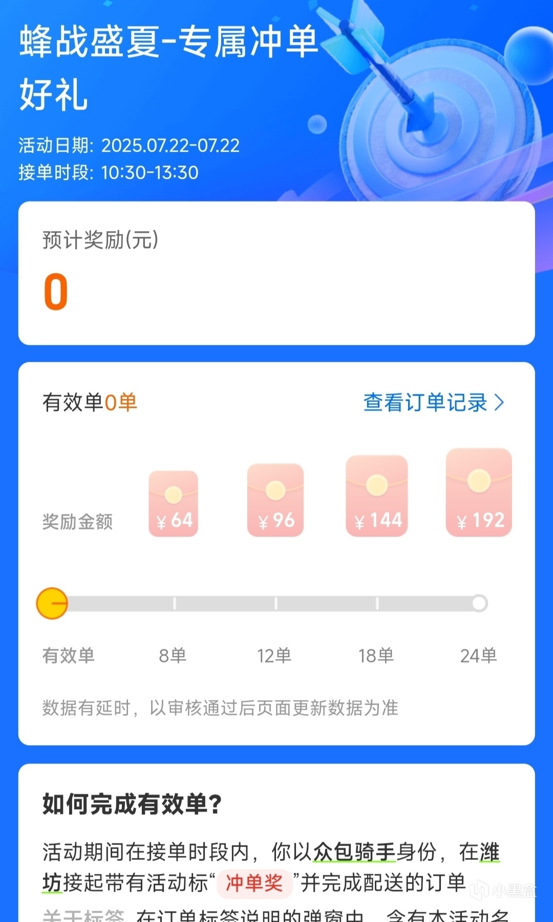活动完成度: 显示距离完成高峰时段奖励、冲单奖励等还差多少单。