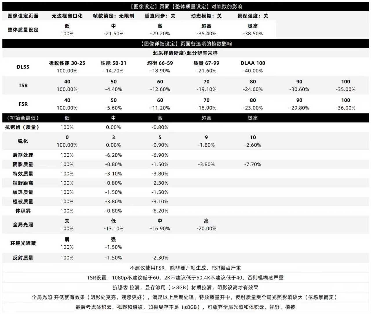 以上是我个人试出来的配置,下面附上b站远古时代装机猿做的图,大家自行参考对帧率的影响,感兴趣的可以去b站支持一下他或者去抄他更详细的设置: