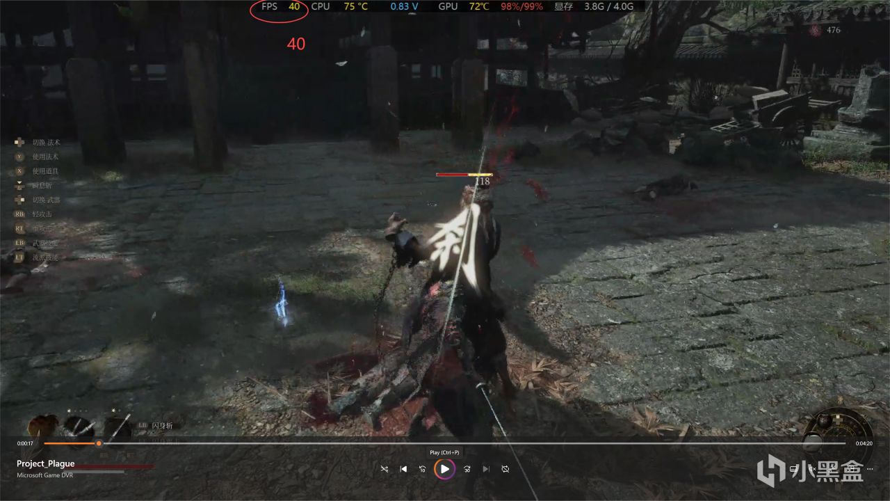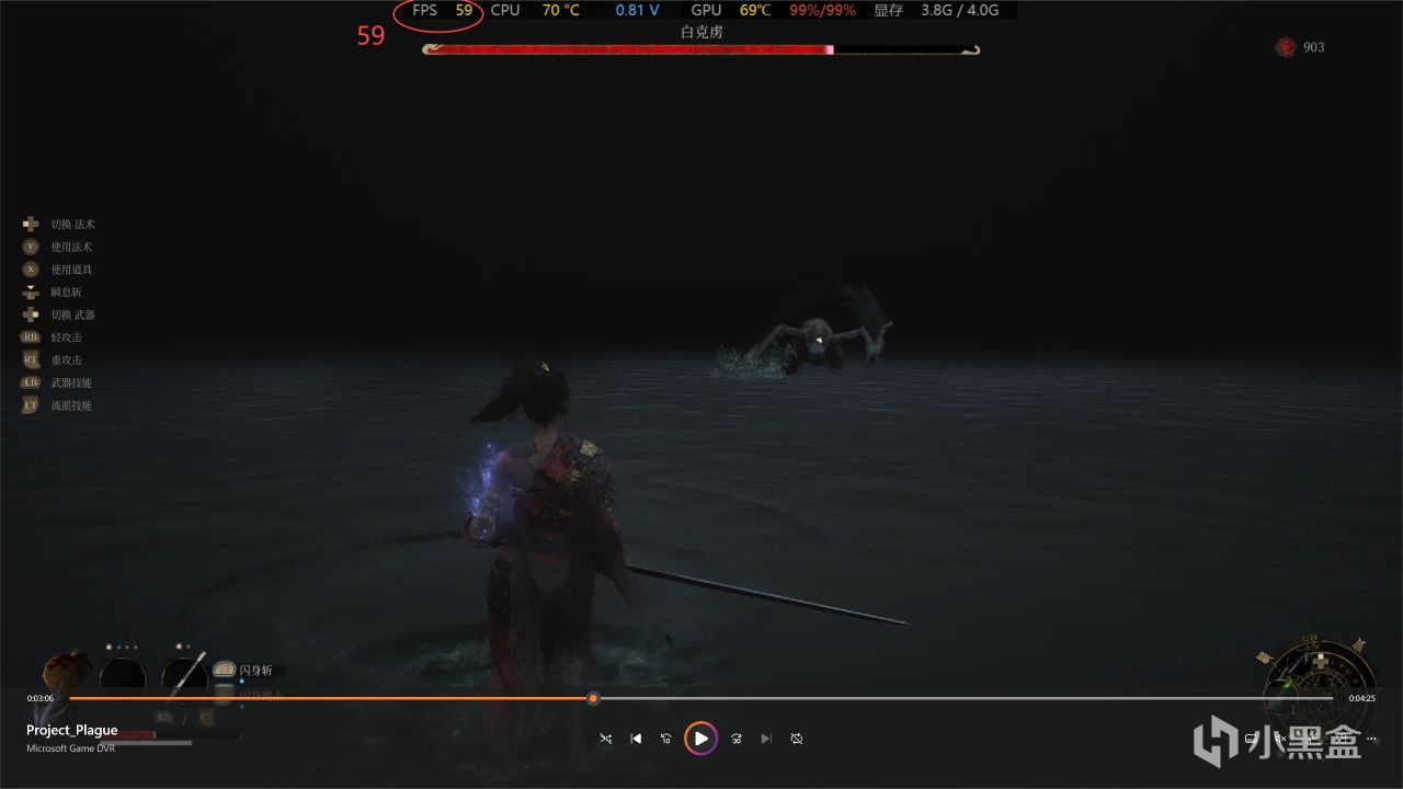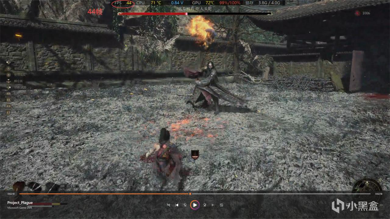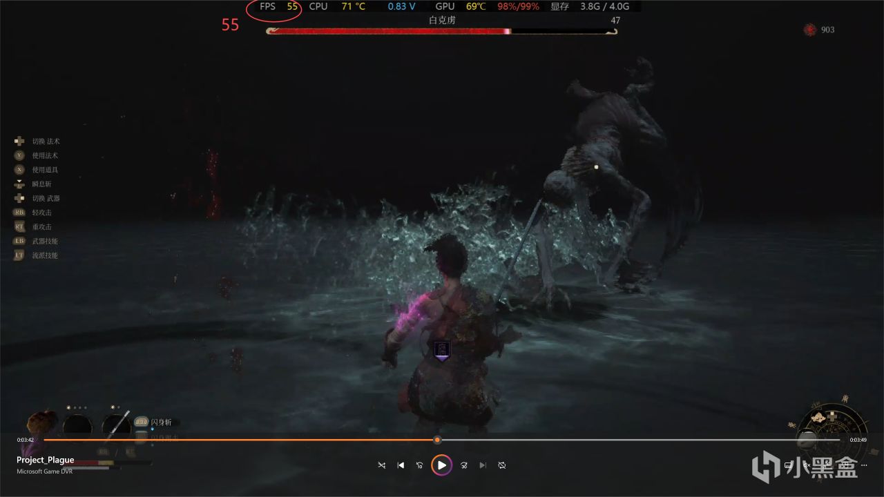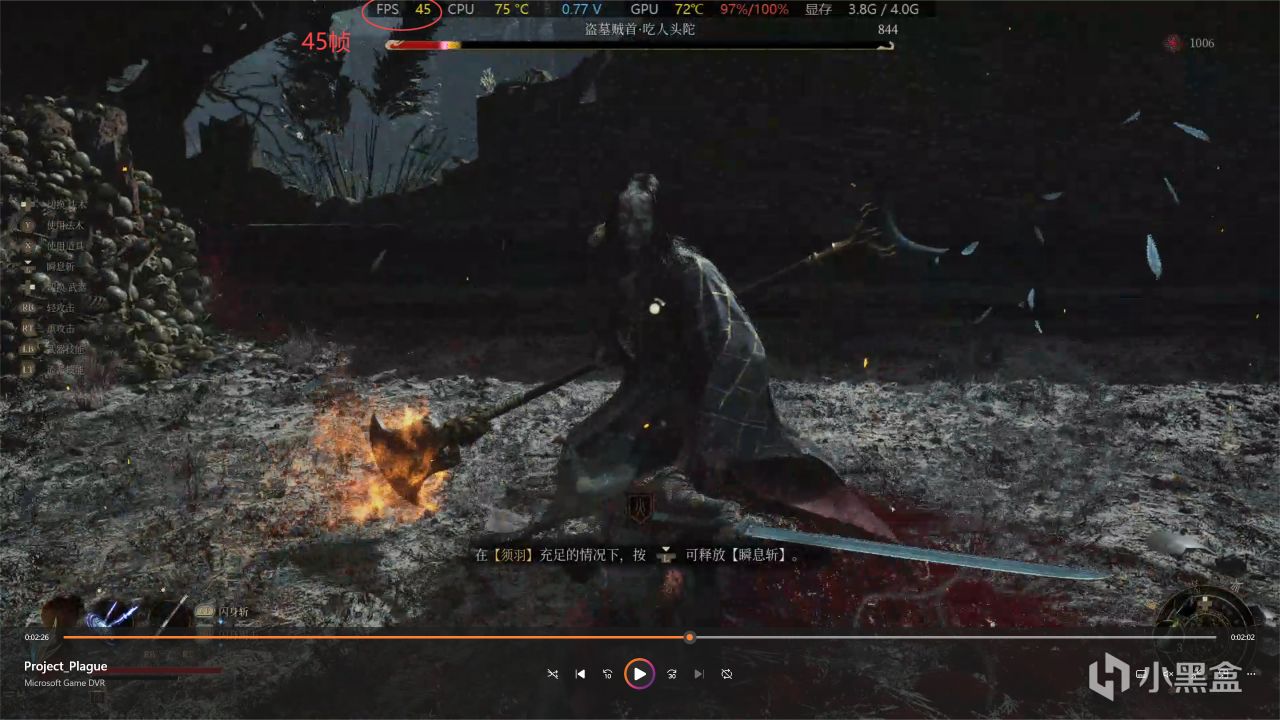 boss战我给你看两个,第一个是开局的新手教学的BOSS,因为是独立的空间,所以帧数很可观,55帧-60帧左右!