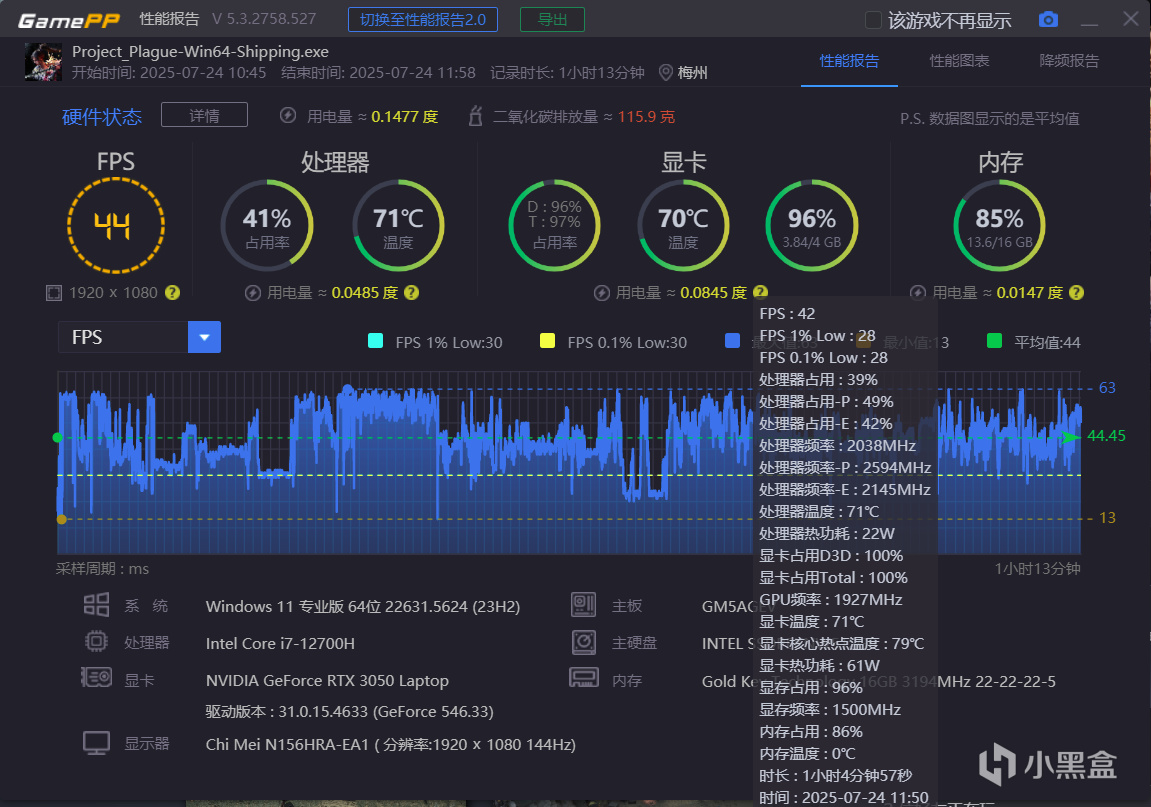先给大家看一张总体的测试,测试时长为一个小时多,平均只有44帧,最高60多一丢丢,然后最低有13帧!
