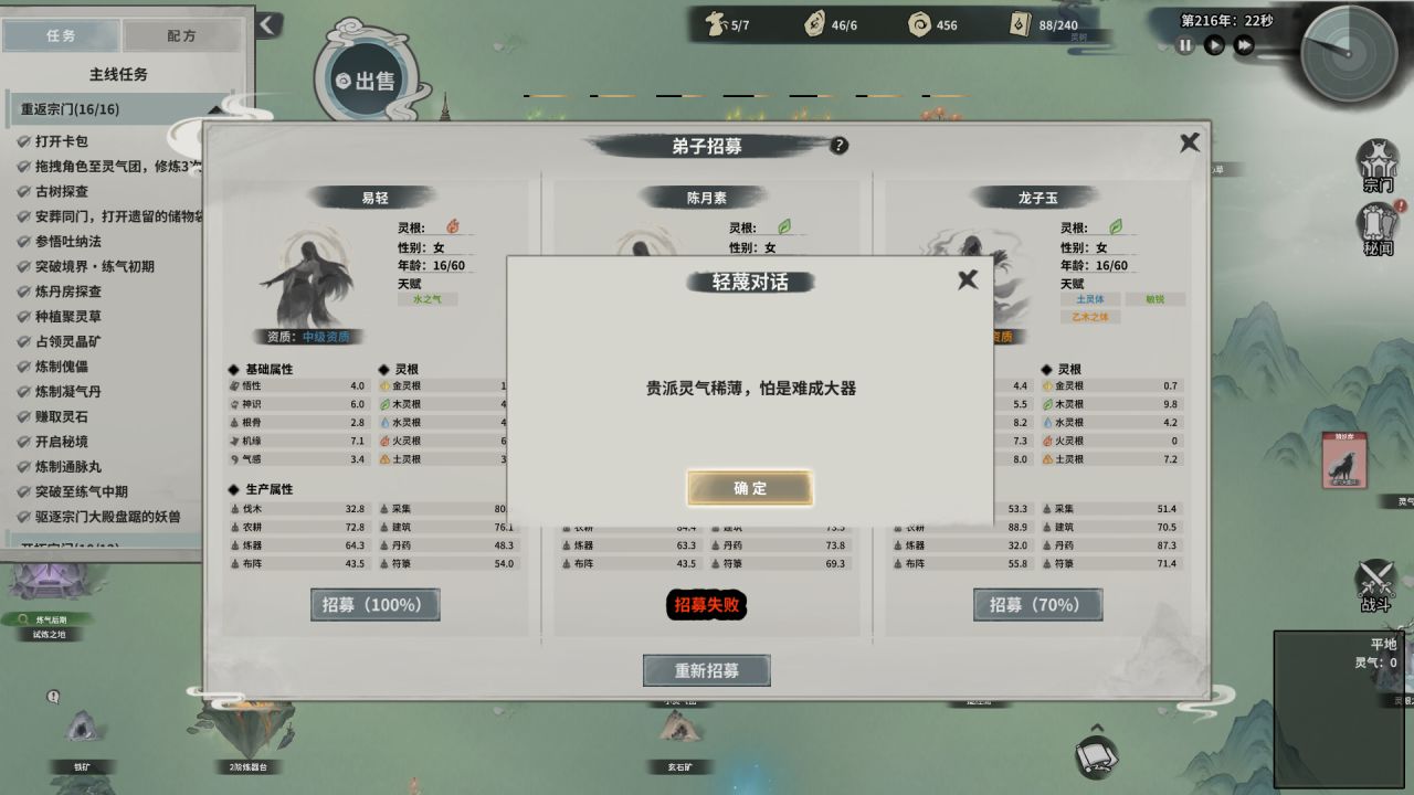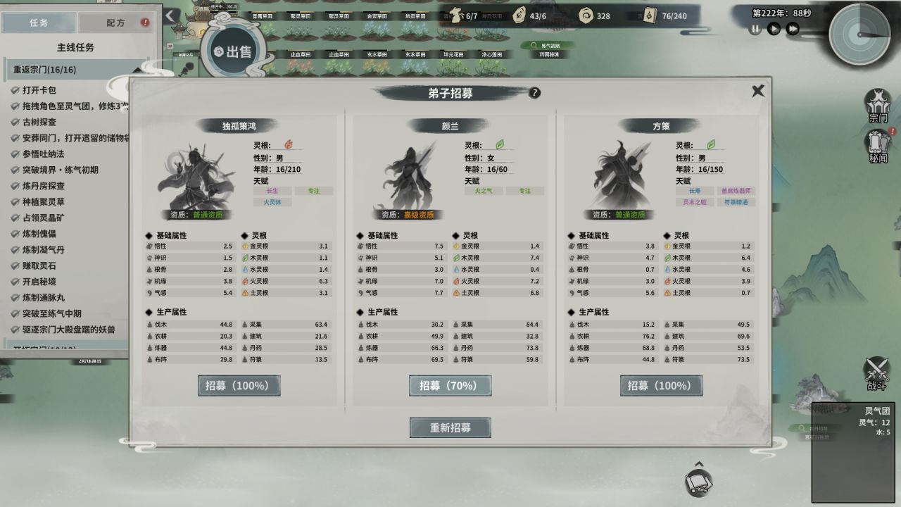 總之,招募開啓後,系統會隨機招出三位資質、靈根、屬性各異的弟子。